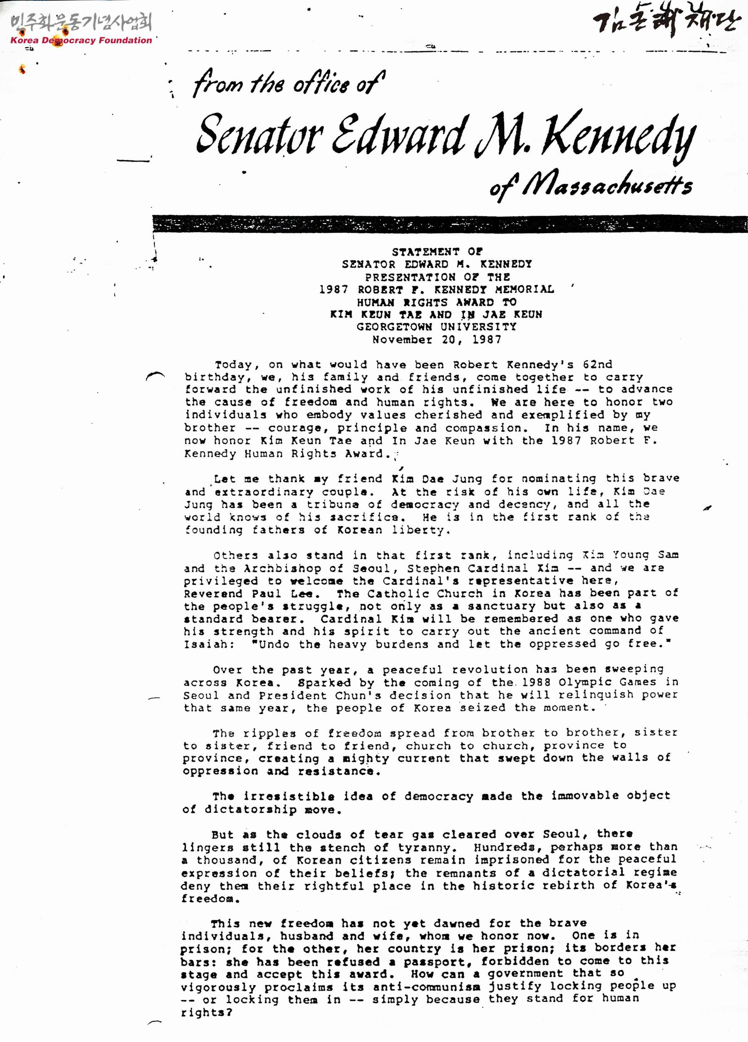 From the office of senator Edward M. Kennedy of Massachusetts(매사추세츠주 상원의원 에드워드 M. 케네디의 집무실에서)