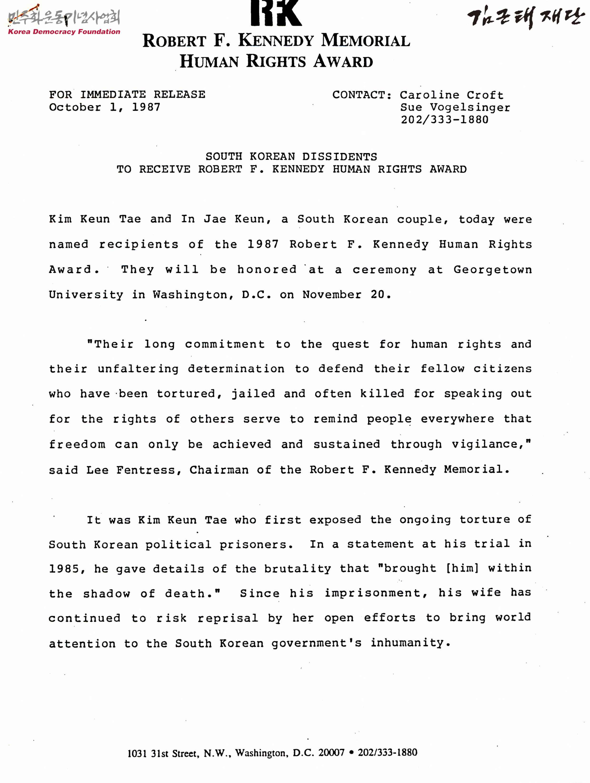 SOUTH KOREAN DISSIDENTS TO RECEIVE ROBERT F. KENNEDY HUMAN RIGHTS AWARD(로버트 케네디 인권상을 받는 한국의 반체제 인사들)