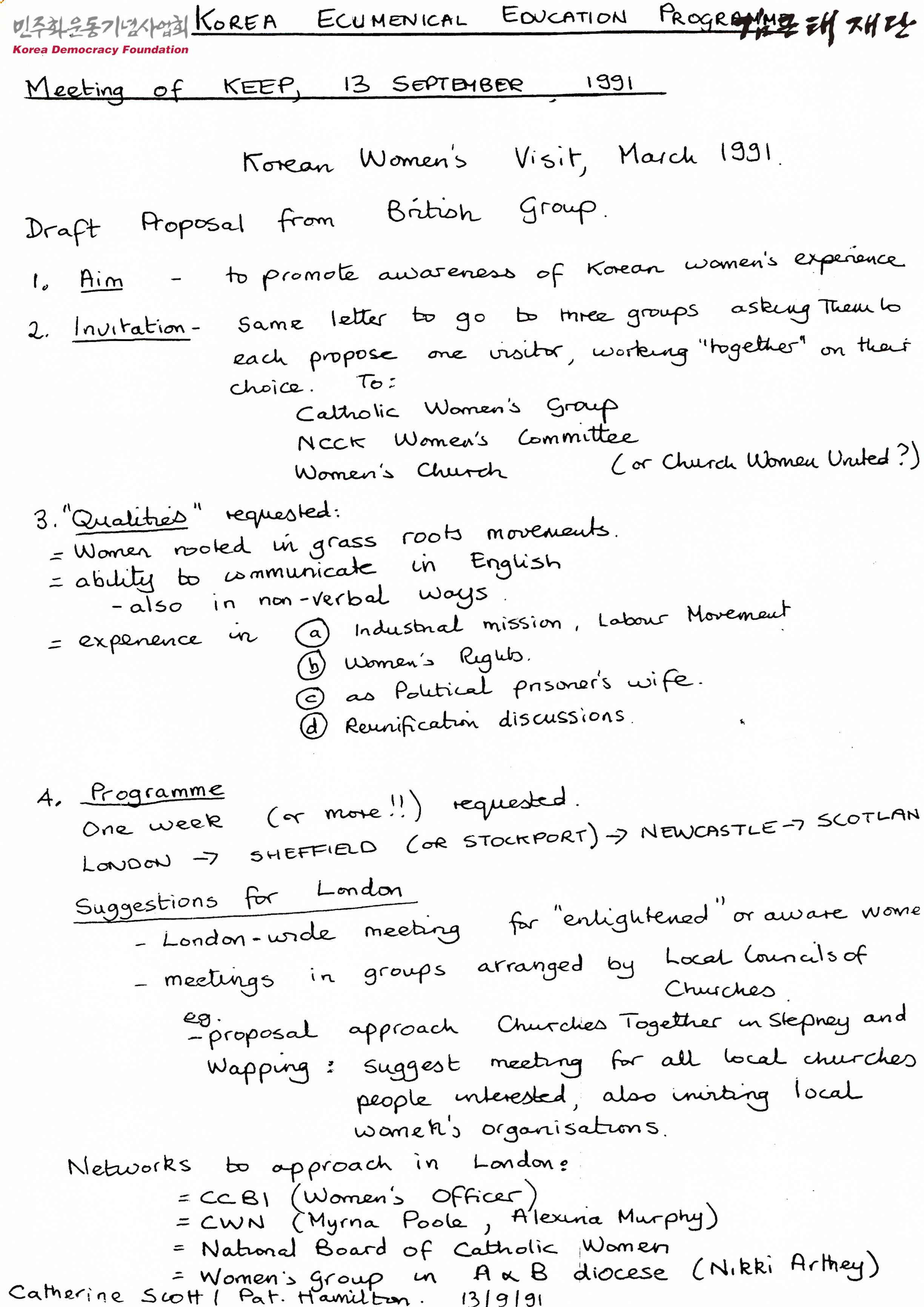 - 한국 에큐메니컬 교육 프로그램 관련 계획서로 한국 여성의 유럽 방문 계획의 일정이 적혀 있음