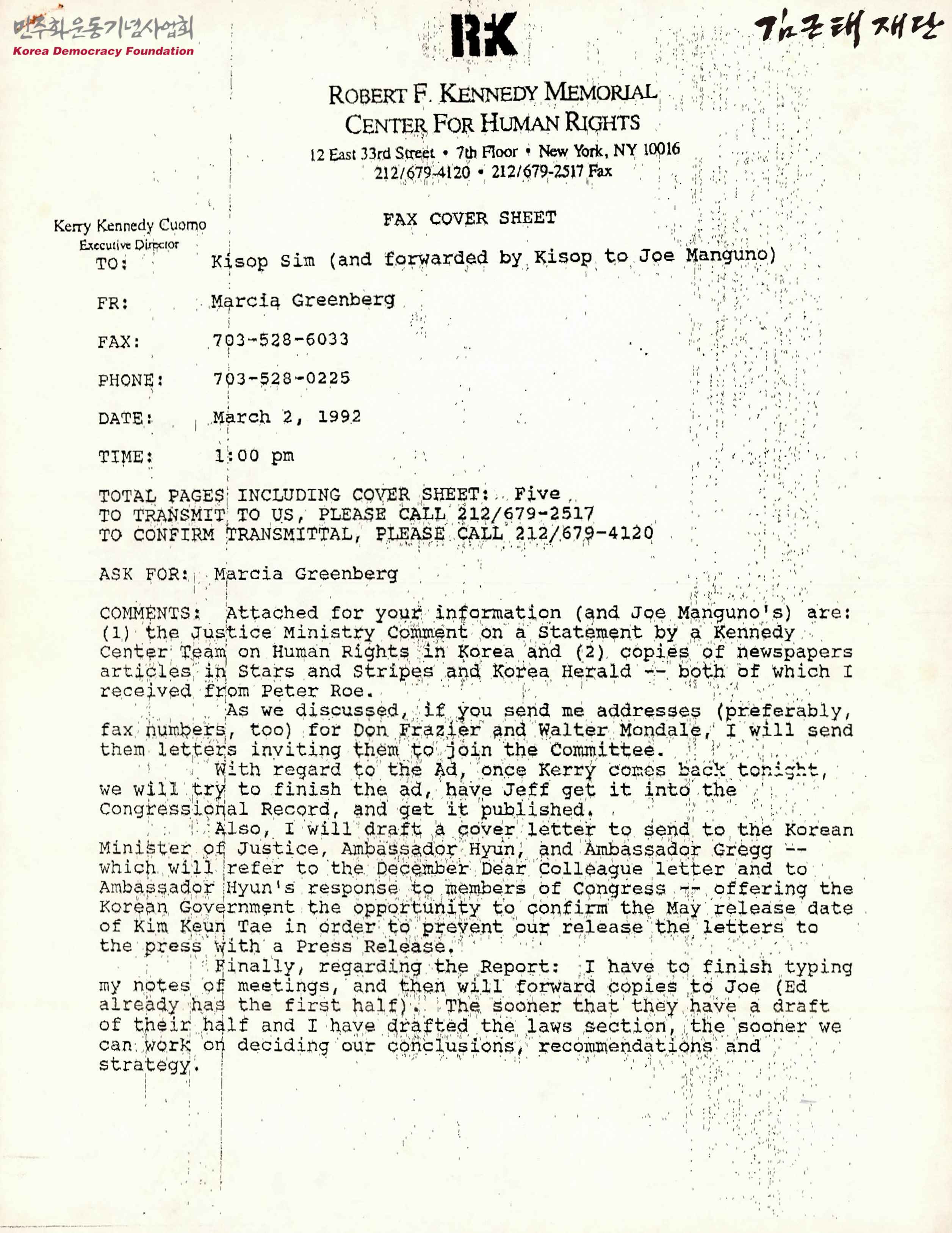 - Don Frazier(돈 프라이저)와 Walter Mondale(윌터 몬델)에게 위원회 가입을 요청한다는 것, 김근태의 5월 석방일자를 확정할 수 있는 기회를 제공한다는 것 등을 다룬 내용과 첨부된 로버트 F. 케네디 기념관이 발표한 성명에 대한민국 법무부가 우려를 표한 성명서