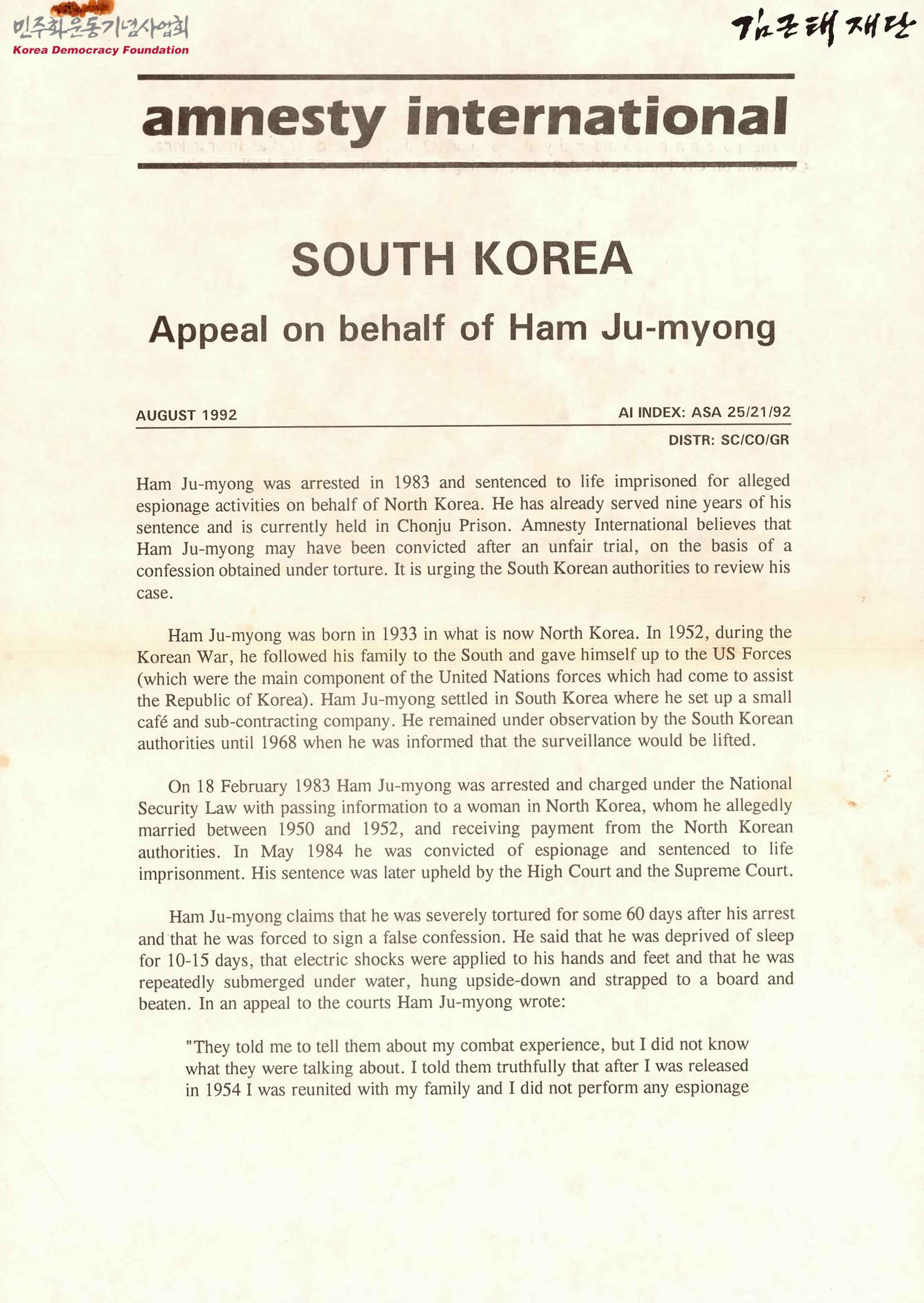 SOUTH KOREA Appeal on behalf of Ham Ju-myong(함주명 대신 항소를 호소한다)