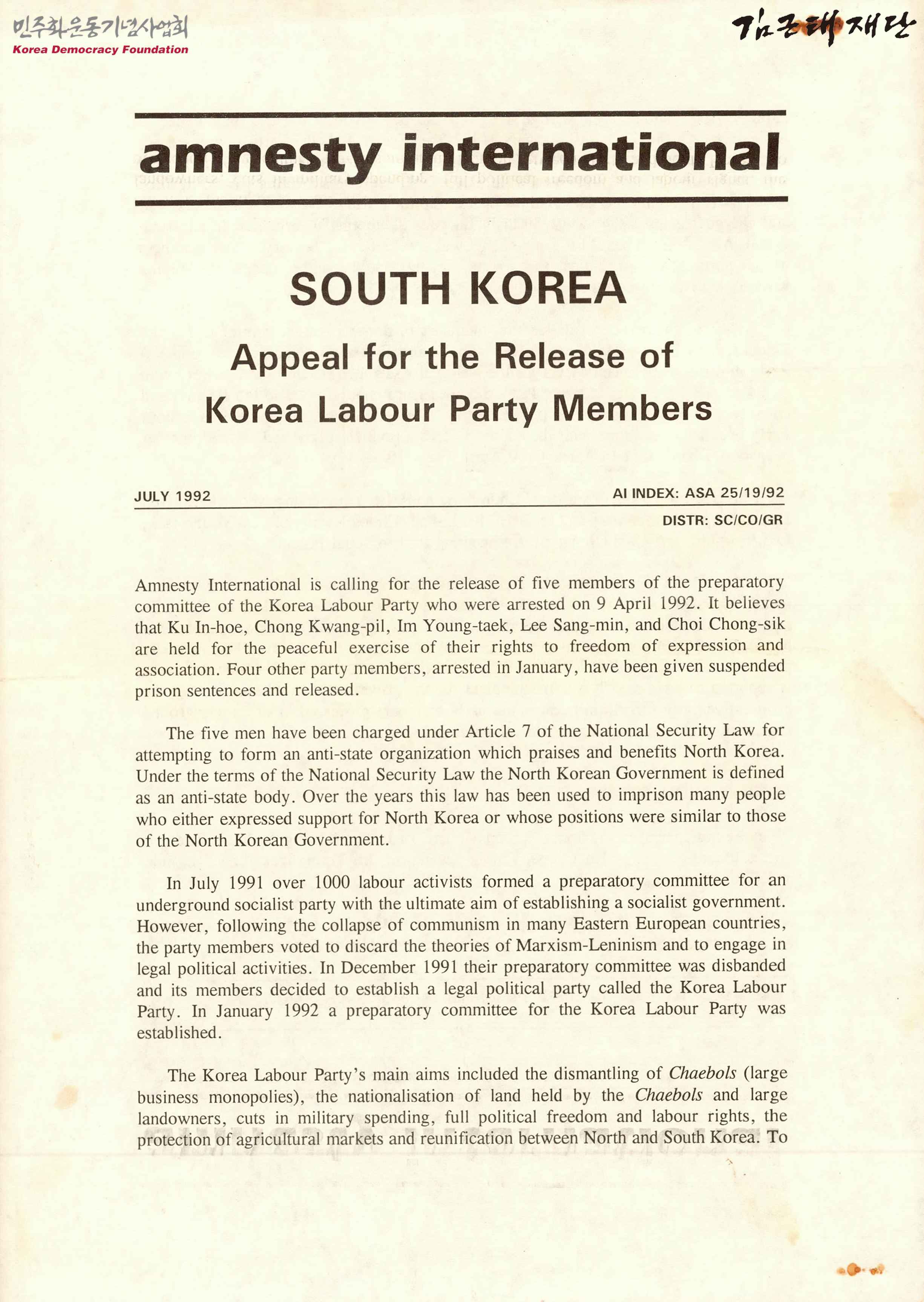 - 국제앰네스티가 1992년 4월 체포된 한국노동당 준비위원 5명의 석방을 요구하고 있고, 김수환 추기경을 비롯한 사회·종교 지도자와 대학교수들도 석방을 요구했다는 것, 한국의 법무부 장관에게 한국노동당 준비위원 5명의 석방을 요구하는 호소문을 보내달라는 내용 등을 다룬 글