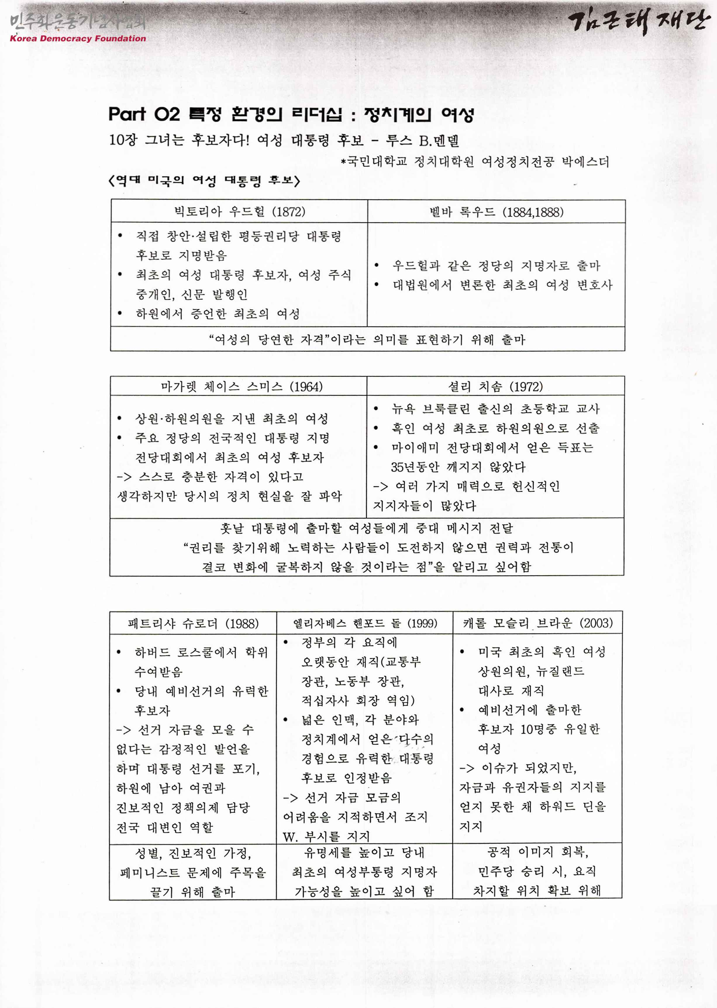 - 루스 B. 멘델의 글, '10장 그녀는 후보자다! 여성 대통령 후보'를 요약한 박에스더의 발제문으로, 내용은 다음과 같음 <역대 미국의 여성 대통령 후보> <대중의 의식, 대중의 태도> <가까워질수록 더욱 흥미로워진다>