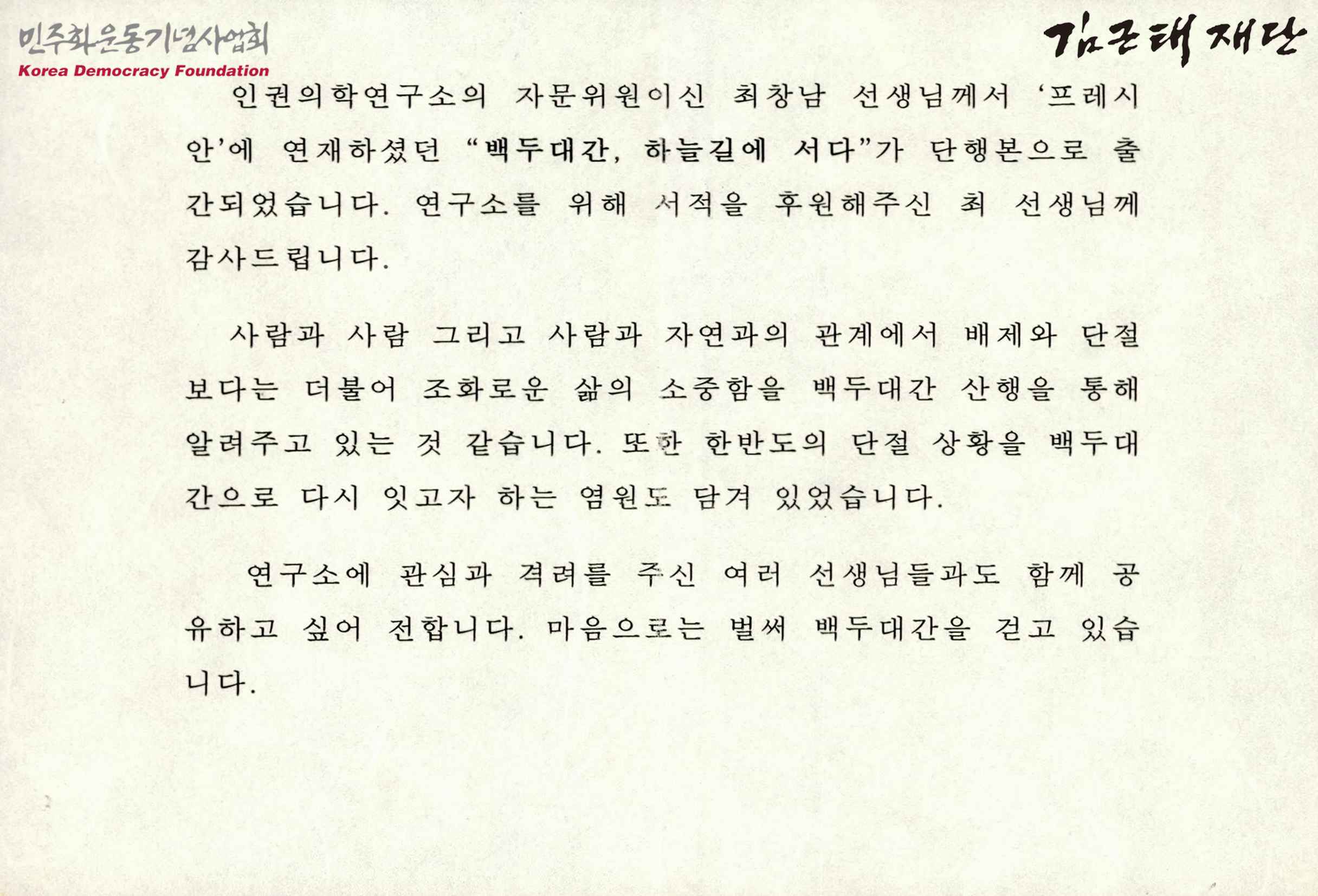 - 백두대간, 하늘길에 서다' 단행본 출간에 있어 서적을 후원해준 최창남에 대한 감사와 책에 대한 소개 등이 적힌 글