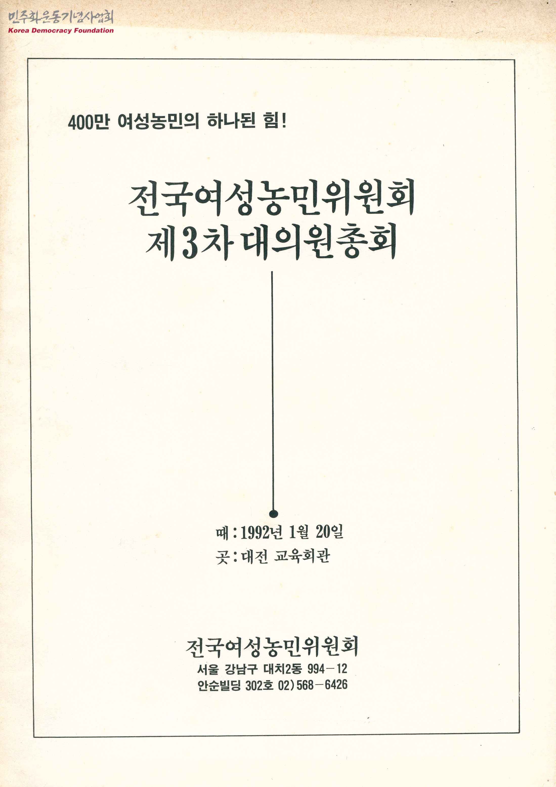 - 전국여성농민위원회 제3차 대의원총회의 일시, 장소가 수록된 자료집으로, 목차는 다음과 같음 - 대회사 - 감사보고서 - 전국여성농민위원회 91년 활동보고 및 평가 - 규약 개정(안) - 전국여성농민위원회 92년 사업계획(안) - 92년 여성농민 투쟁방향 - 결의문 - 다 함께 신명나는 노래를···