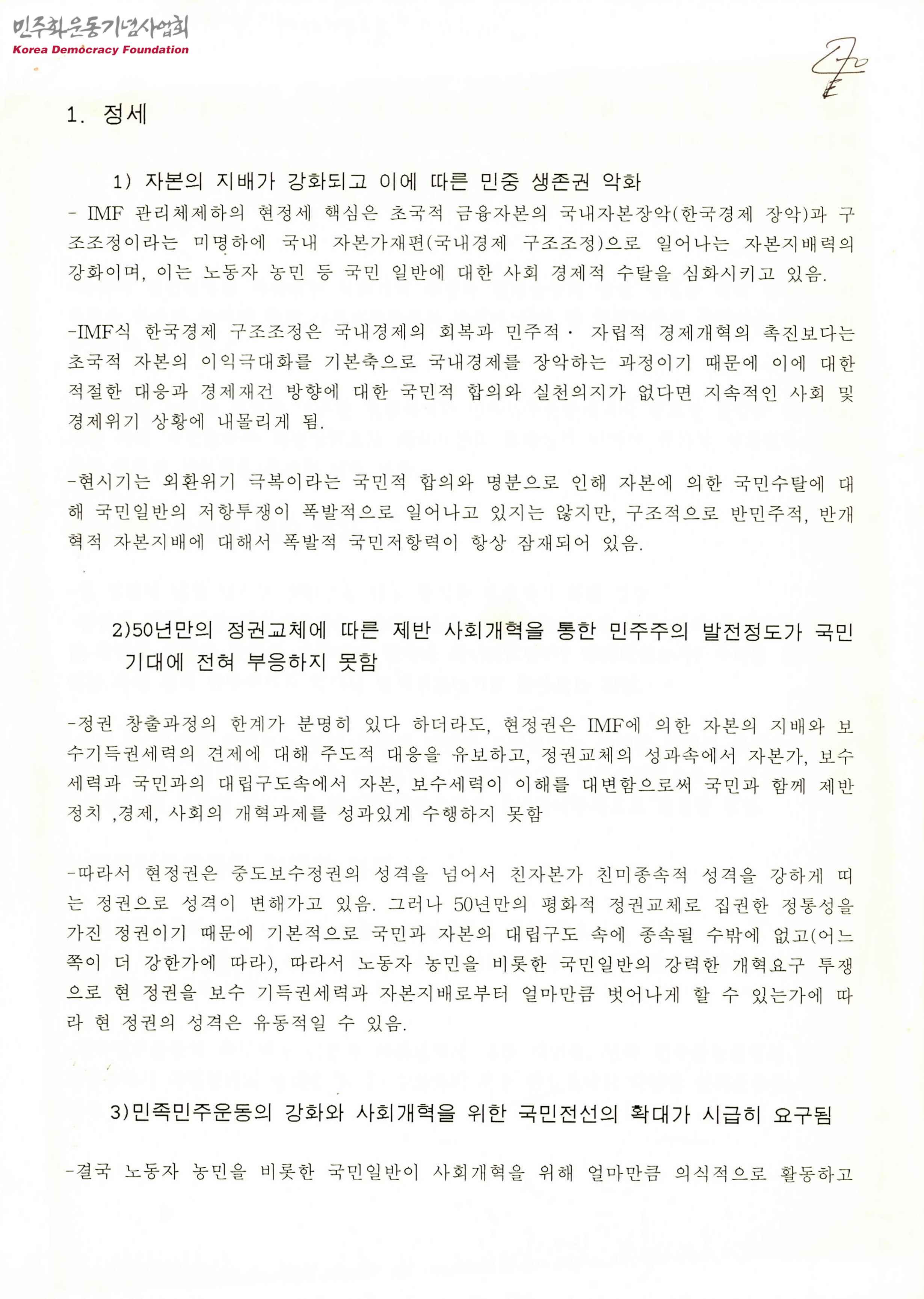 - 전국농민회총연맹 경북도연맹 토론회의 발제문으로 다음과 같은 내용 등이 수록됨 1. 정세 2. 김대중 정권에 대한 평가 3. 민족민주운동의 방향과 과제 4. '98전농 사업평과와 전농의 사업방향 5. 전농의 조직현안에 대한 진단과 과제
