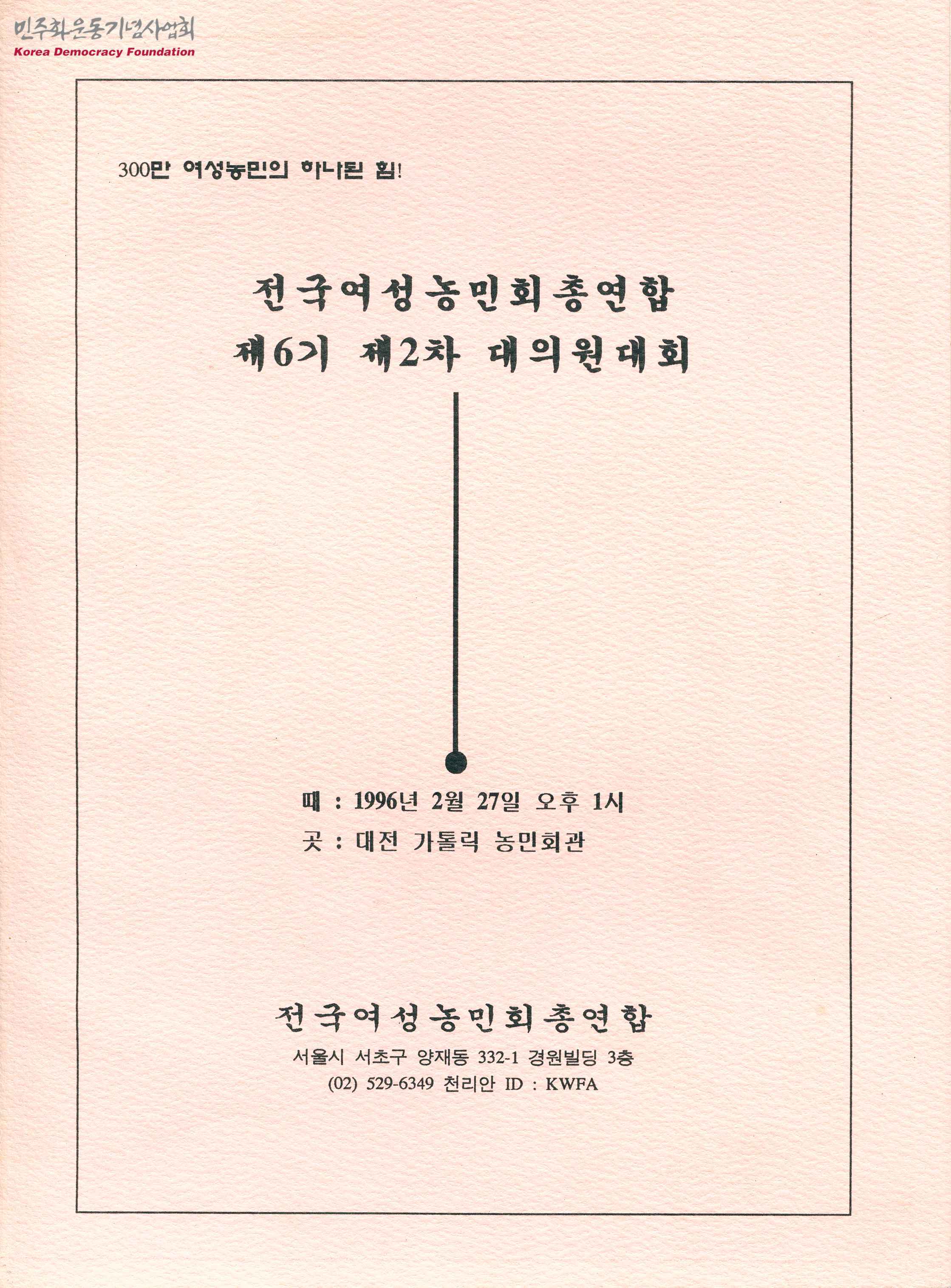 - 96년 2월 27일 진행된 전국여성농민회총연합 제6기 제2차 대의원대회의 자료집으로 아래와 같은 목차로 구성되어 있음 - 대회사 - 감사보고서 - '95년 활동보고 및 평가 - 회칙개정안 - '96년 사업계획(안) - 정부당국과 여야4당에 요청하는 여성농민 정책공약 - 공로장 수상자 명단 - 자료1/'95년 성명서 - 자료2/도여성농민회연합 '95년 활동보고 및 평가 - 자료3/도여성농민회연합 '96년 사업계획 - 자료4/도여성농민회연합 회칙