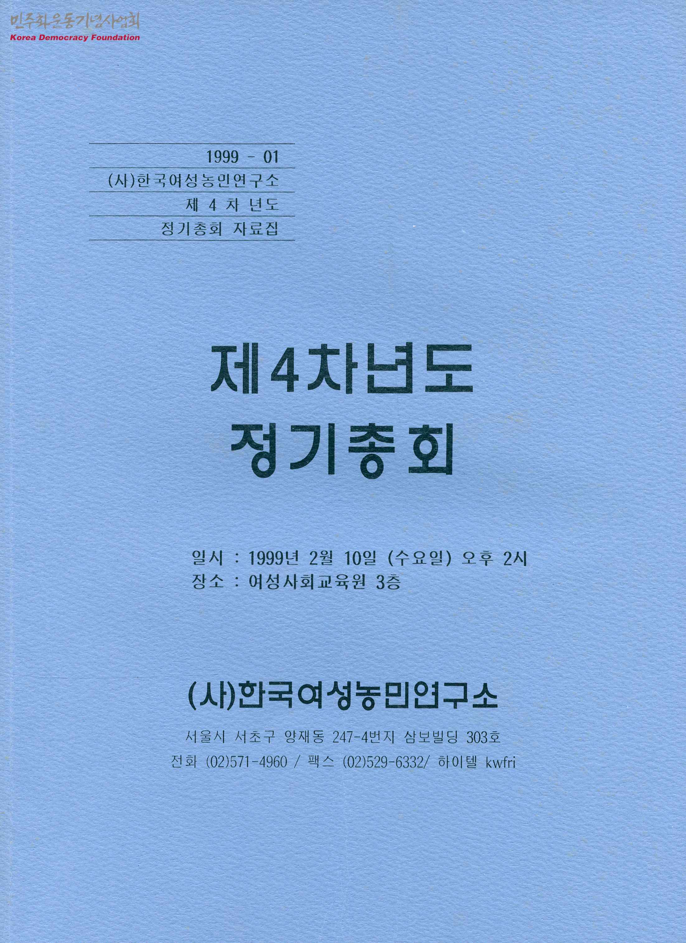 - 한국여성농민연구소의 제4차년도 정기총회 자료집으로 아래와 같은 목차로 구성되어 있음 - 대회사 - 1998년도 감사보고서 - 1998년도 사업 및 결산보고 - 정관개정(안) - 임원 선출 - 1999년도 사업 및 예산계획(안) - 자료1. 농업정보 - 자료2. (사)여성농민연구소 정관 - (사)여성농민연구소 회원 명단