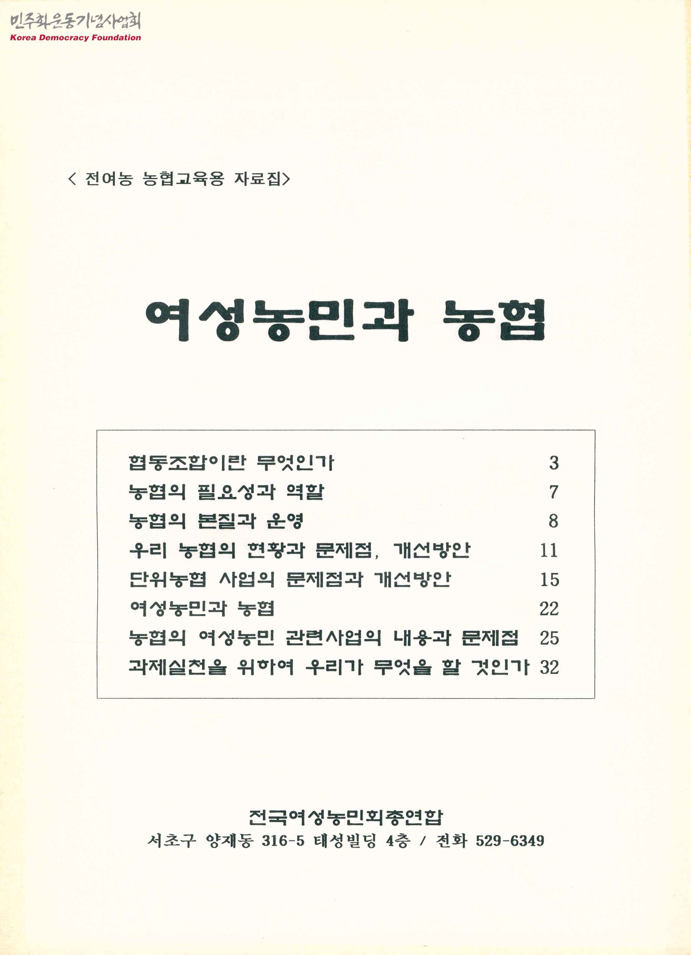 - 95년 1월 10일부터 이틀간 진행된 전여농교육인 '여성농민과 농협'의 자료집으로 아래와 같은 목차로 구성되어 있음 - 협동조합이란 무엇인가 - 농협의 필요성과 역할 - 농협의 본질과 운영 - 우리 농협의 현황과 문제점, 개선방안 - 단위농협 사업의 문제점과 개선방안 - 여성농민과 농협 - 농협의 여성농민 관련사업의 내용과 문제점 - 과제실천을 위하여 우리가 무엇을 할 것인가