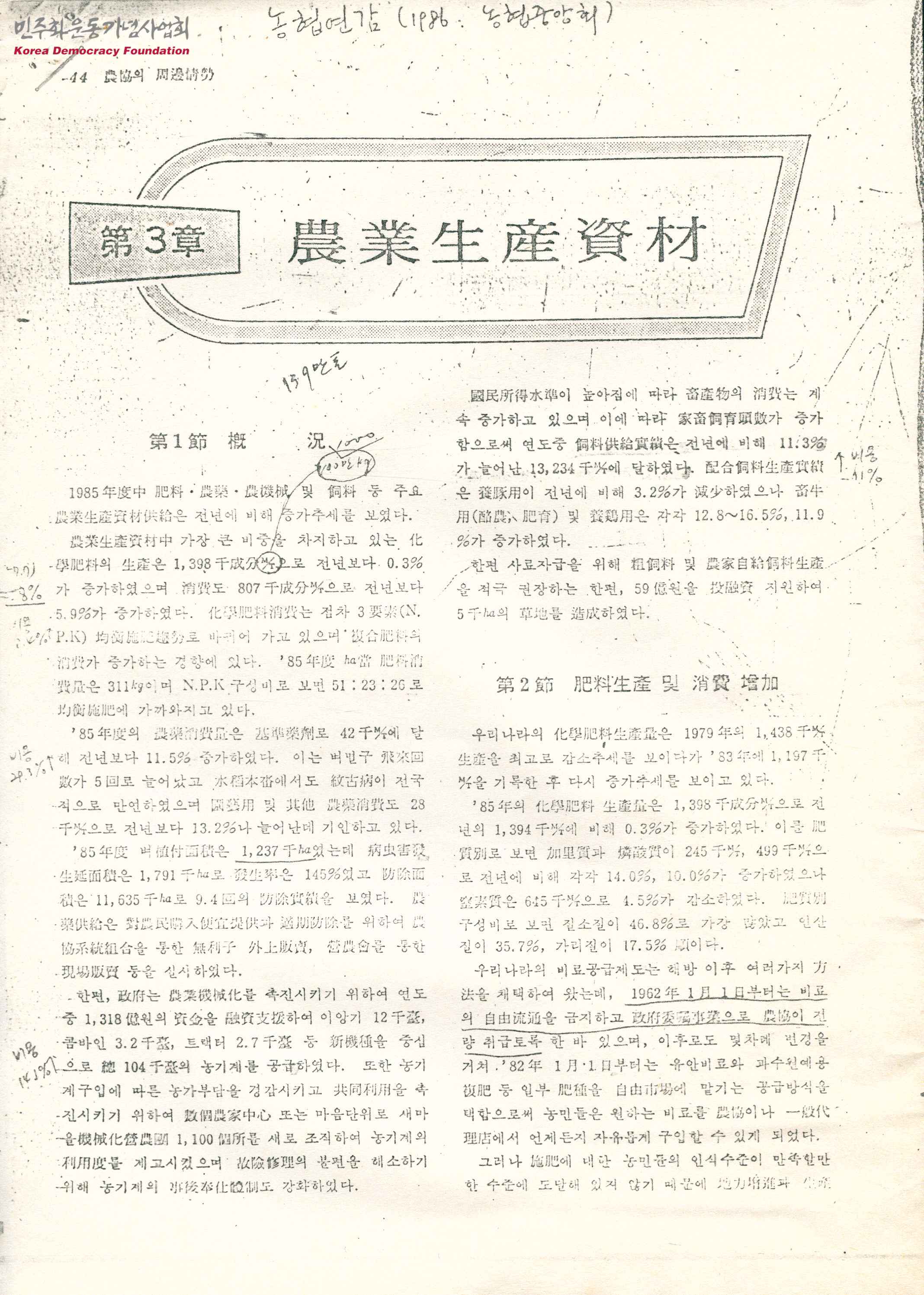 - 농협연감의 제3장으로 아래와 같은 내용으로 구성되어 있음 제1절 개황 제2절 비료생산 및 소비 증가 제3절 농약소비의 증가 제4절 농업기계화사업의 지속적 추진 제5절 사료소비의 증가