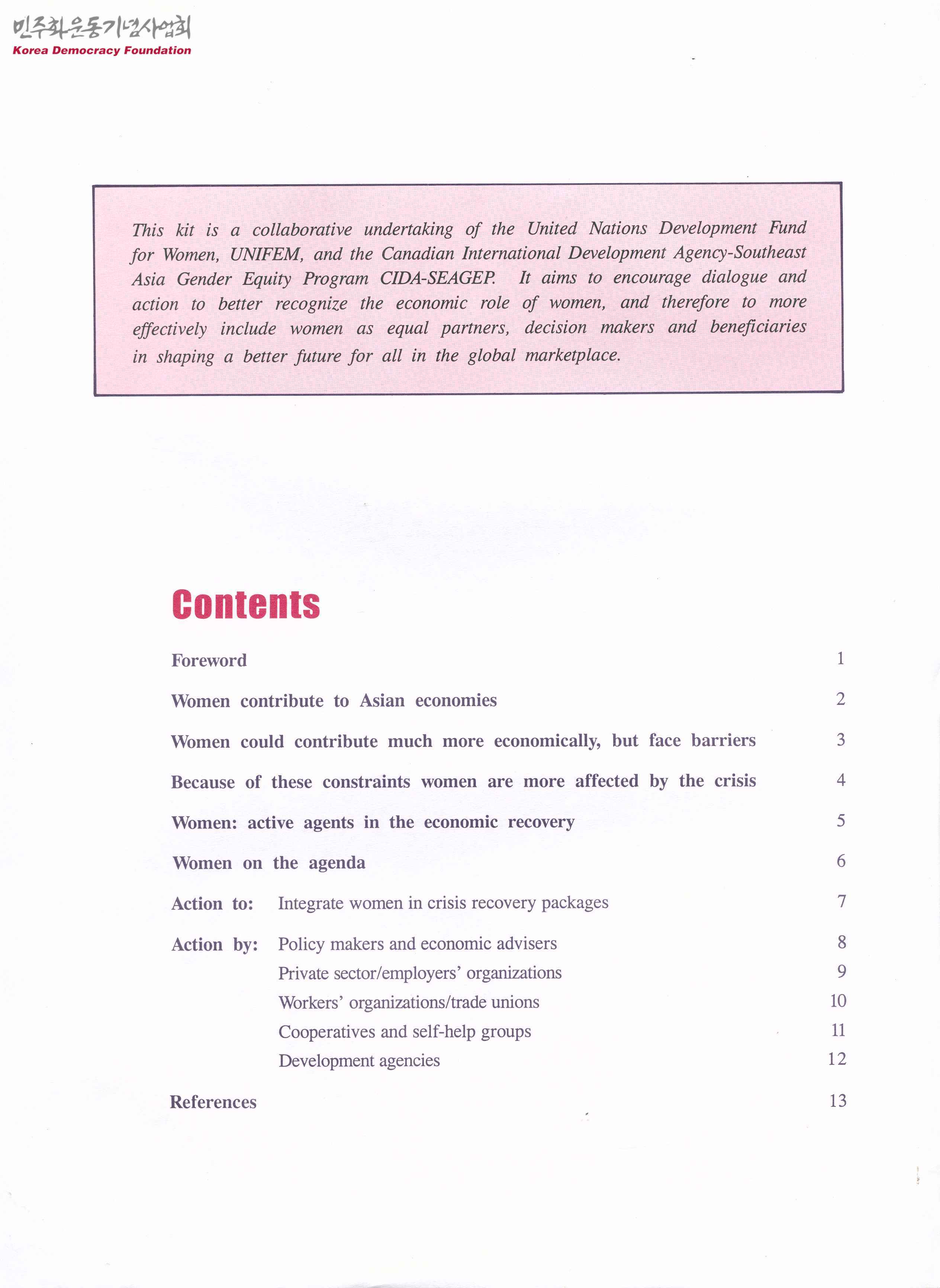 - 여성의 경제적 역할에 대한 인식과 여성을 동등한 파트너이자 의사 결정자 및 수혜자에 포함시키는 것을 목표로 하는 영문 키트로 목차는 다음과 같음 - Foreword(서문) - Women contribute to Asian economies(여성들은 아시아 경제에 기여한다) - Women could contribute much more economically, but face barriers(여성들은 더 경제적으로 기여할 수 있지만, 장벽에 직면한다) - Because of these constraints women are more affected by the crisis(이러한 제약 때문에 여성들은 위기의 영향을 더 많이 받는다) - Women: active agents in the economic recovery(여성, 경제회복의 적극적 주제) - Women on the agenda(의제에 오른 여성들) - Action to : Integrate women in crisis recovery packages(조치대상 : 위기복구 패키지에 여성들을 통합합니다) - Action by : Policy makers and economic advisers(조치자 : 정책 입안자 및 경제고문) - References(참조)