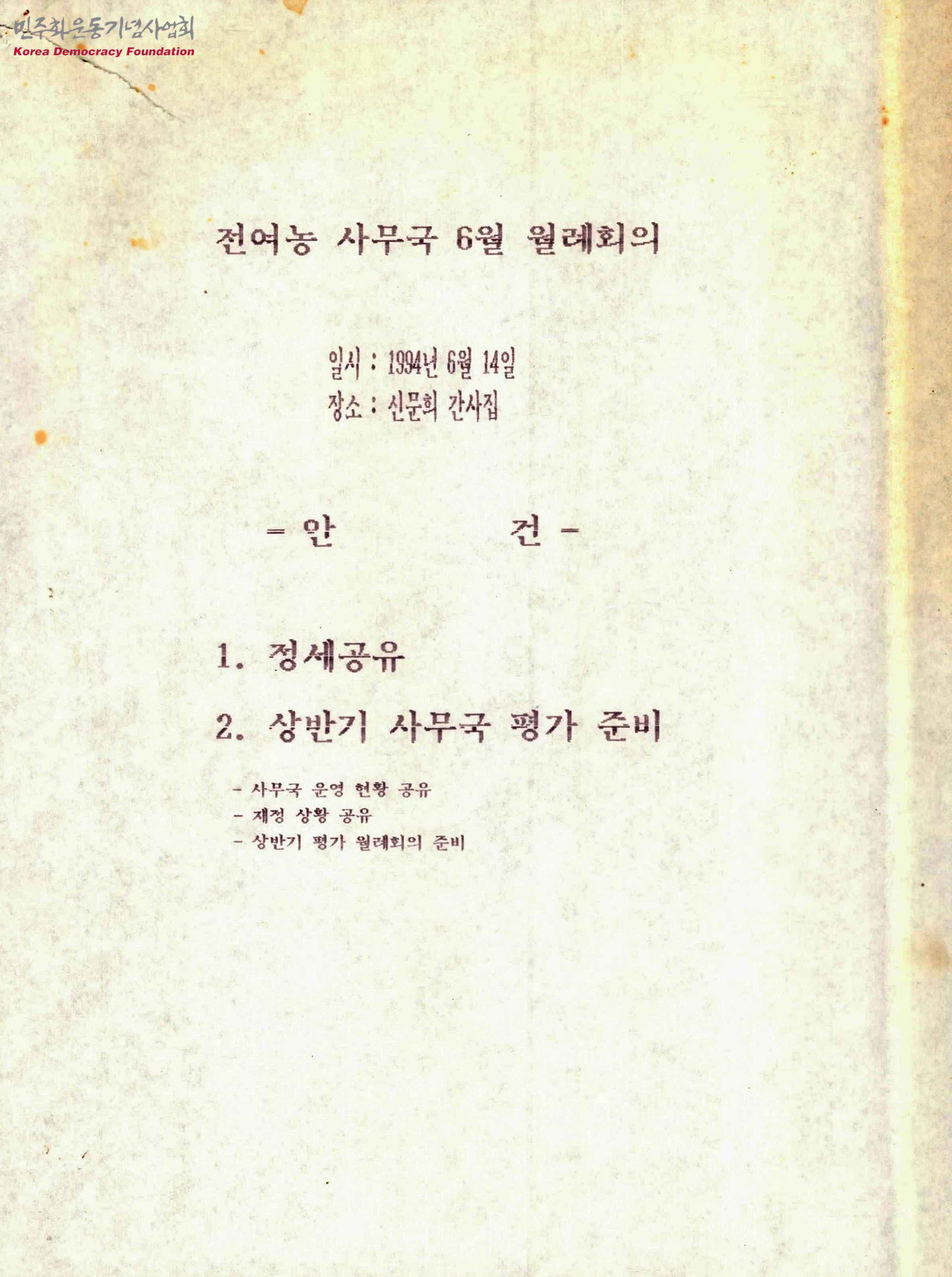 - 전여농 사무국 6월 월례회의 보고서로 아래와 같은 내용이 실려 있음 - 전여농은 지금 무엇을 해야 하는가? - 전농 투쟁 일정 안내 - 재정보고