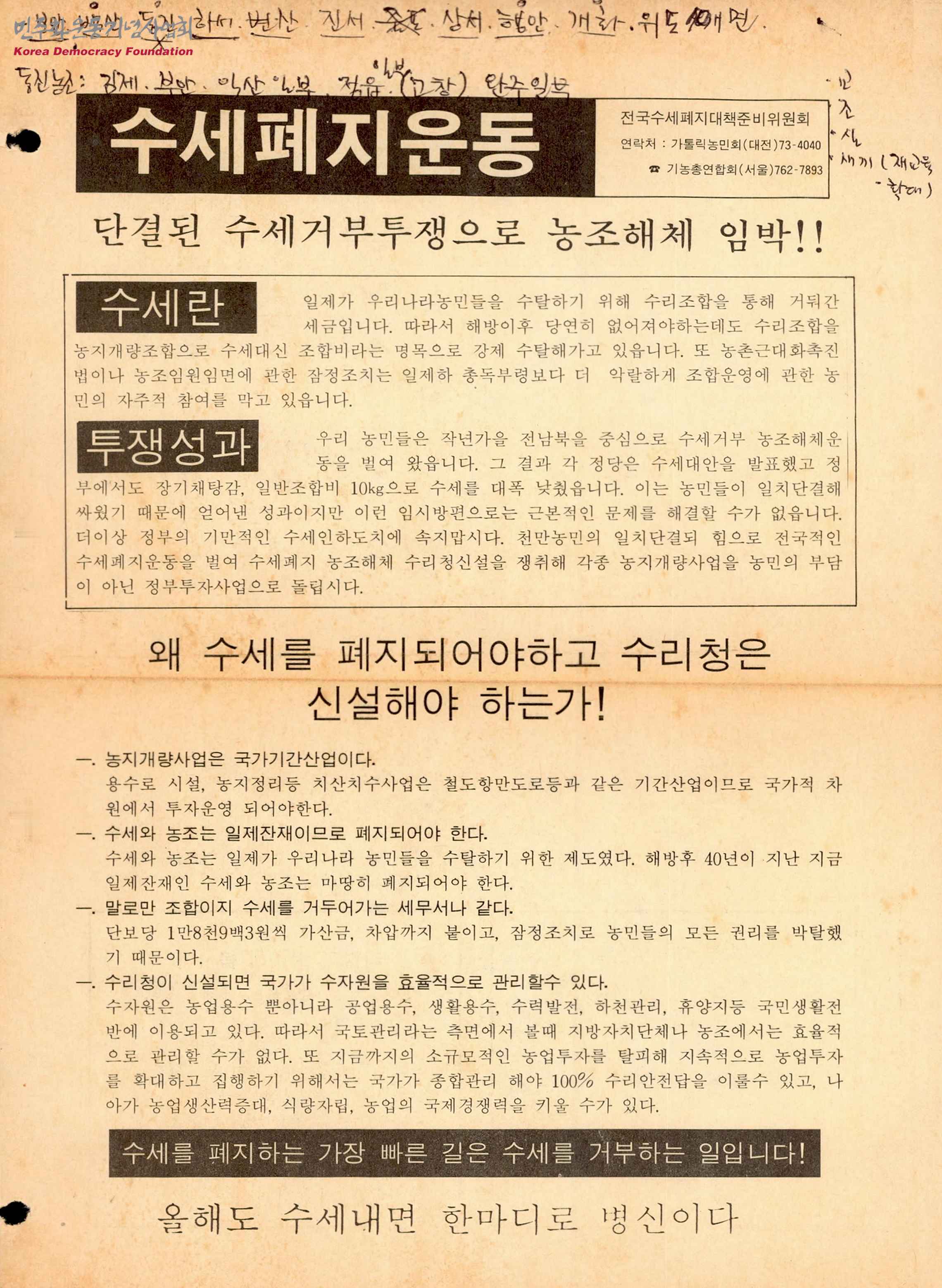 - 수세폐지운동에 관련된 유인물로 수세의 의미와 그동안의 투쟁의 성과, 수세가 폐지되어야 하는 이유, 수리청이 신설되어야 하는 이유 등이 적혀있음