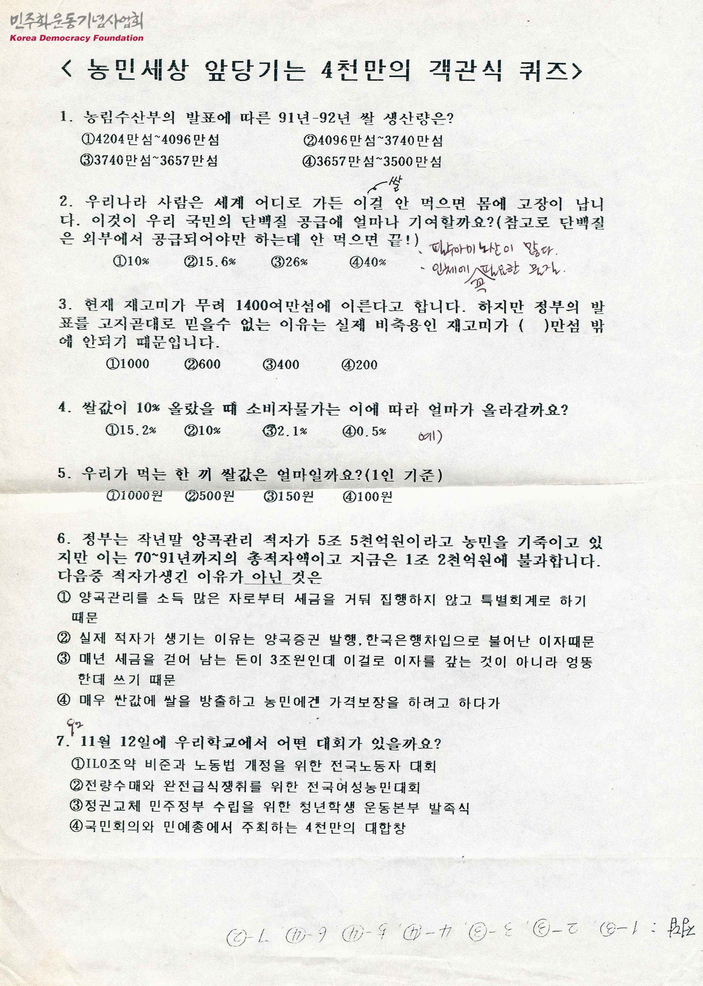 - 1992년 경희대학교 총학생회에서 발행한 문서로 '농민세상 앞당기는 4천만의 객관식 퀴즈'를 주제로 하고 있으며 1992년 11월 12일 열리는 전량수매와 완전급식쟁취를 위한 전국여성농민대회를 이야기하고 있음