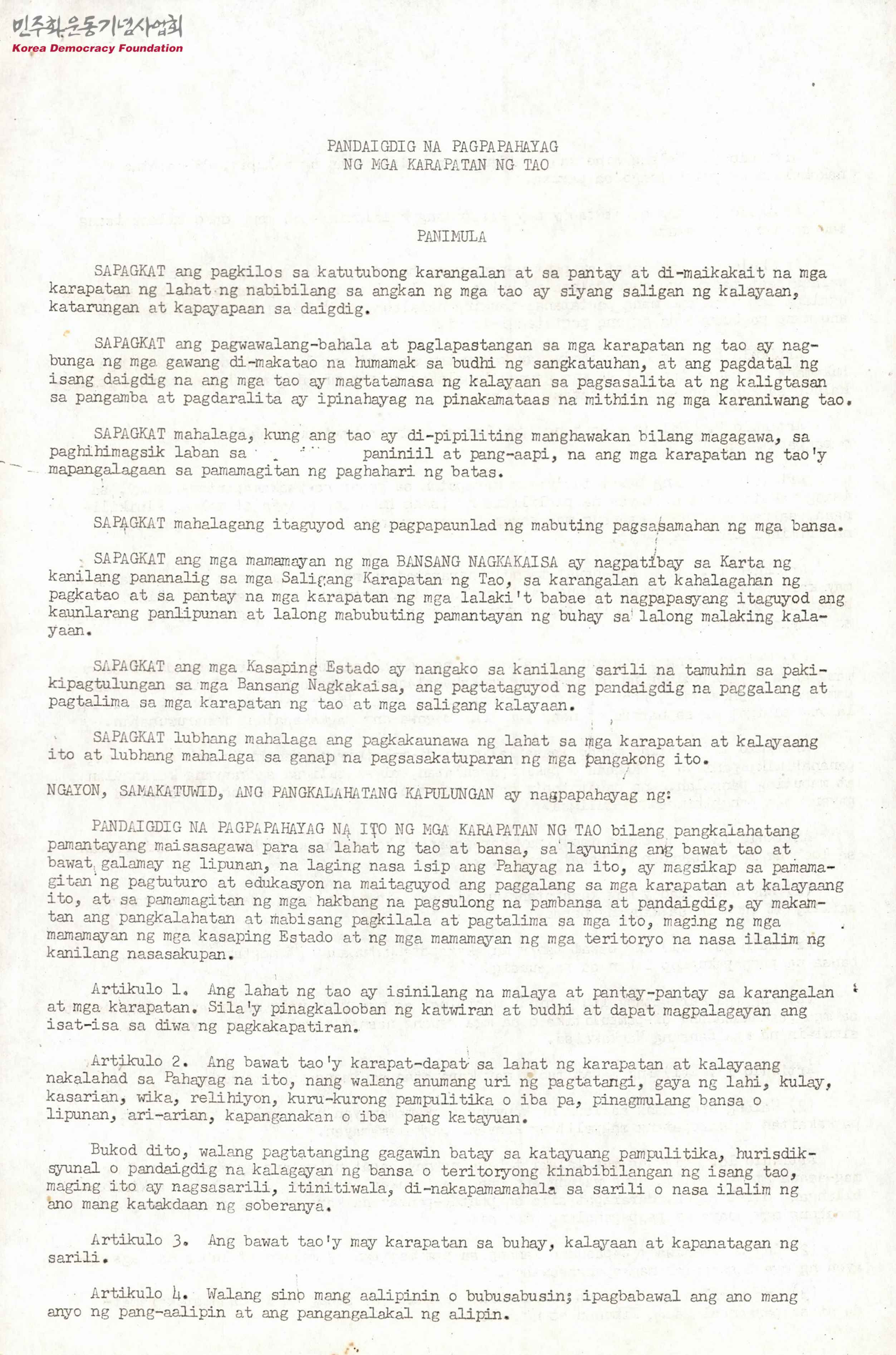 - 세계인권선언을 필리핀어로 작성한 문서로 '제1조 모든 인간은 태어날 때부터 자유로우며 그 존엄과 권리에 있어 동등하다. 인간은 천부적으로 이성과 양심을 부여받았으며 서로 형제애의 정신으로 행동하여야 한다.', '제3조 모든 사람은 생명과 신체의 자유와 안전에 대한 권리를 가진다.' 등의 내용을 수록하고 있음