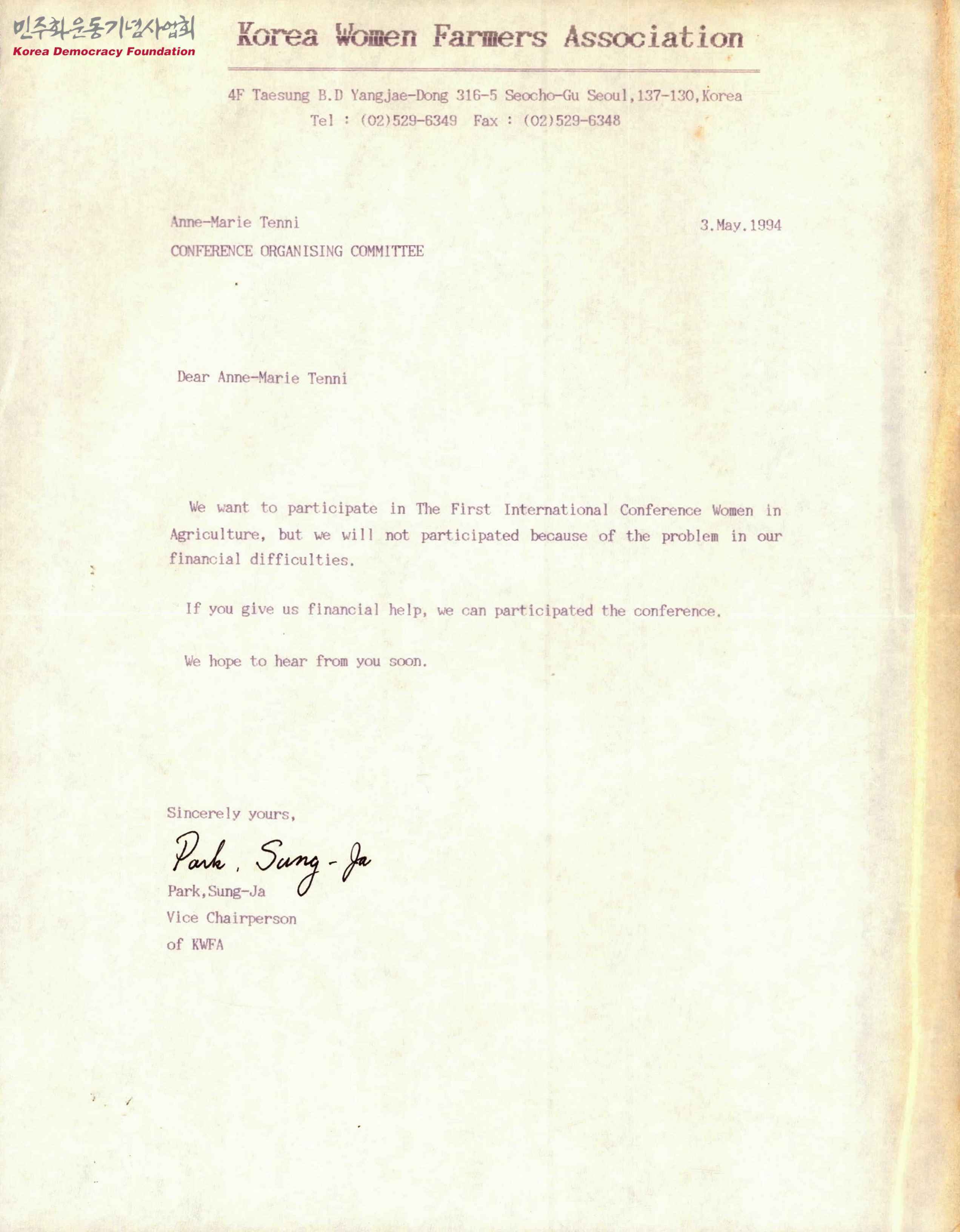 - 한국여성농업인협회장 박성자가 안나 마리 테니에게 보낸 문서로 제1회 농업분야 국제회의 여성대회에 참가차 재정적 도움을 준다면 대회에 참가할 수 있으니 회신을 주면 좋겠다고 이야기하고 있음