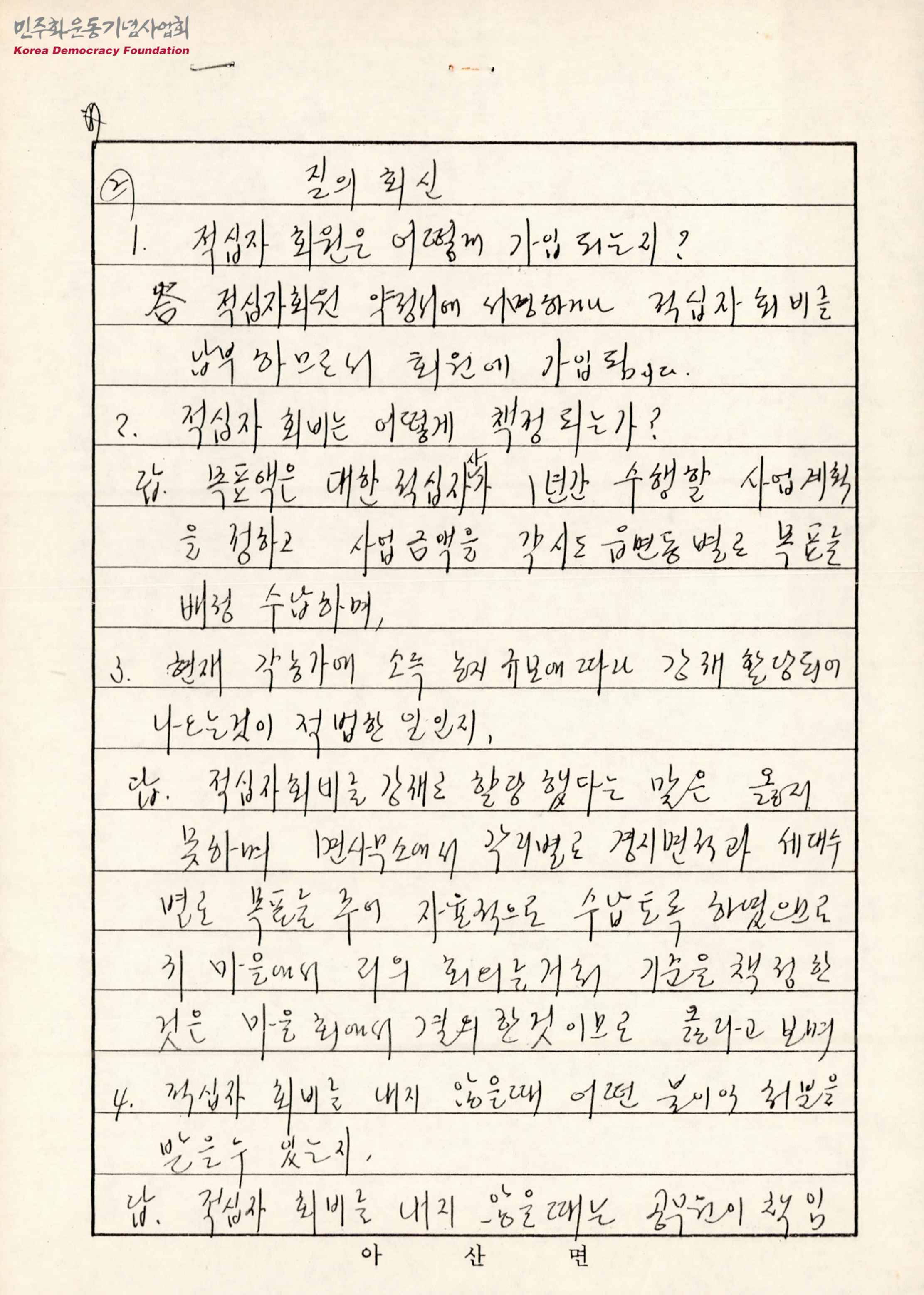 - 아산면장 이동희가 적십자비에 대한 질문에 대하여 답변한 문서로 '적십자 회원은 어떻게 가입되는지?', '적십자 회비는 어떻게 책정되는지?', '적십자 회비를 내지 않을때 어떤 불이익 처분을 받을 수 있는지?' 등에 대한 답변 내용을 수록하고 있음