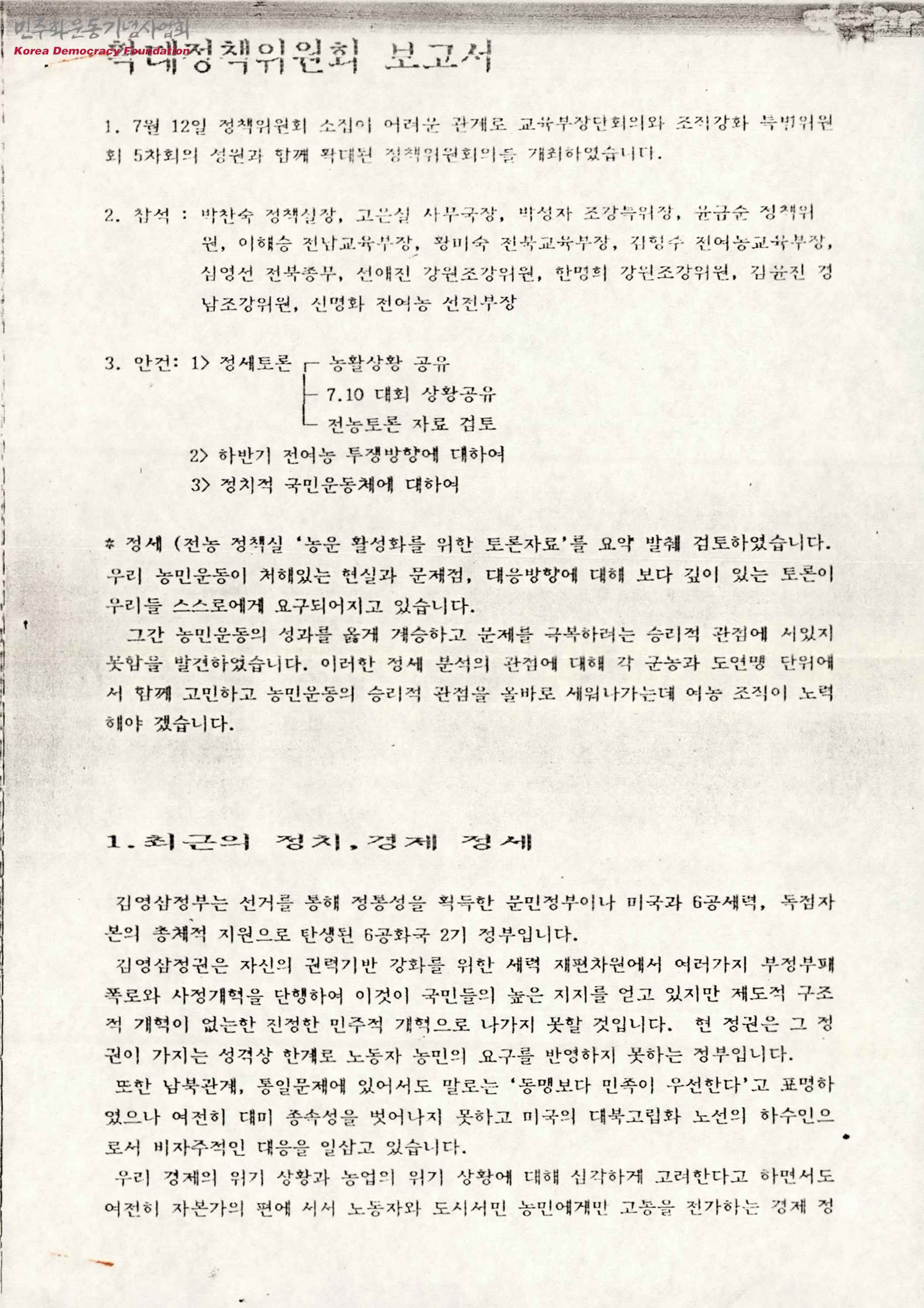- 전국여성농민회총연합 확대정책위원회 보고서로 '최근의 정치·경제 정세', '민민운동권의 현황', '전여농의 하반기 정세 전망', '민민운의 과제' 등의 내용을 수록하고 있음