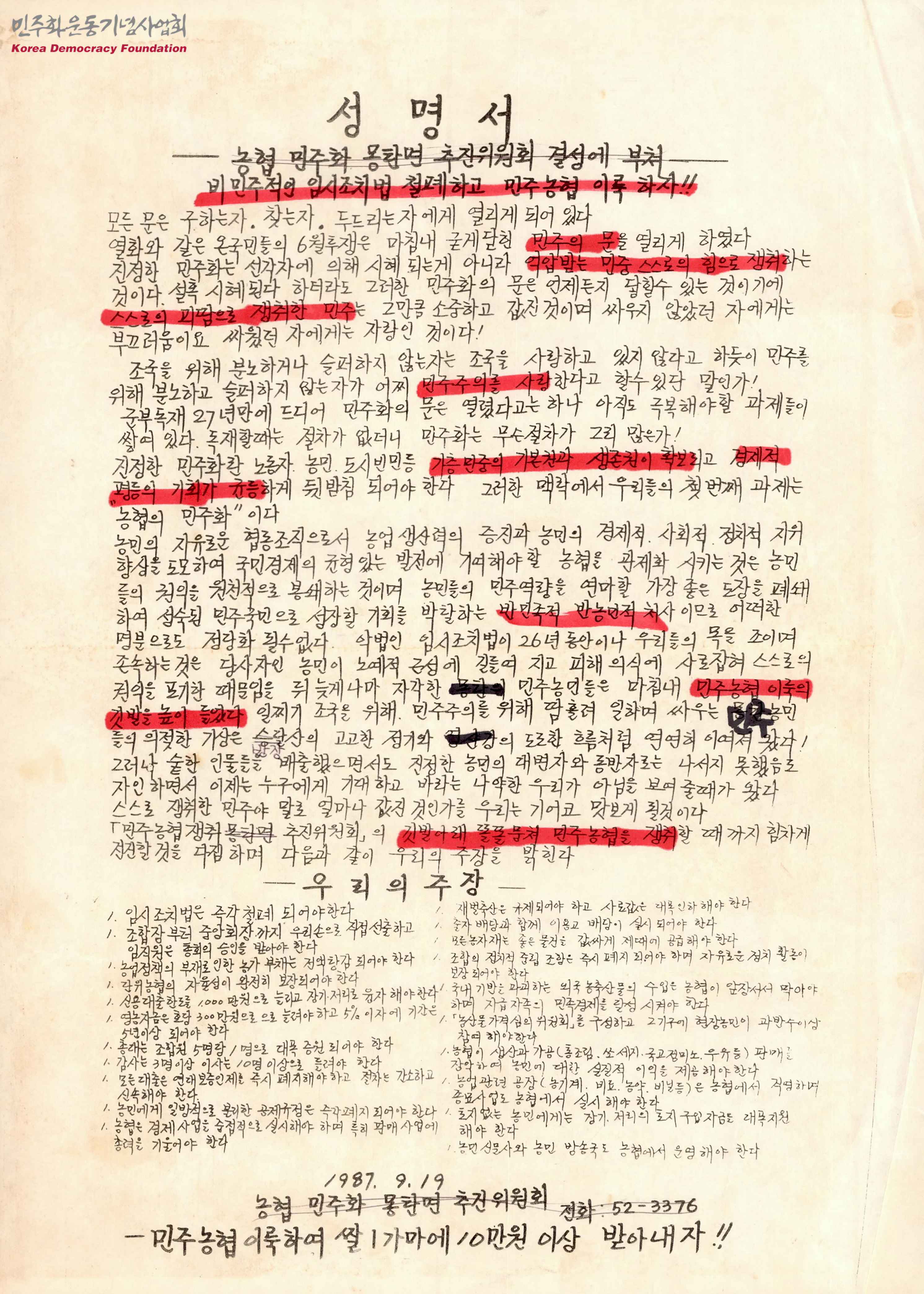 - 1987년 작성된 성명서로 기층 민중의 기본권과 생존권이 확보되고 경제적 평등의 기회가 균등하고 보장되는 진정한 민주화를 이루기 위해 비민주적인 임시조치법을 즉시 철폐하고 민주농협을 이룩할 때까지 투쟁할 것을 다짐하는 내용을 포함하고 있음