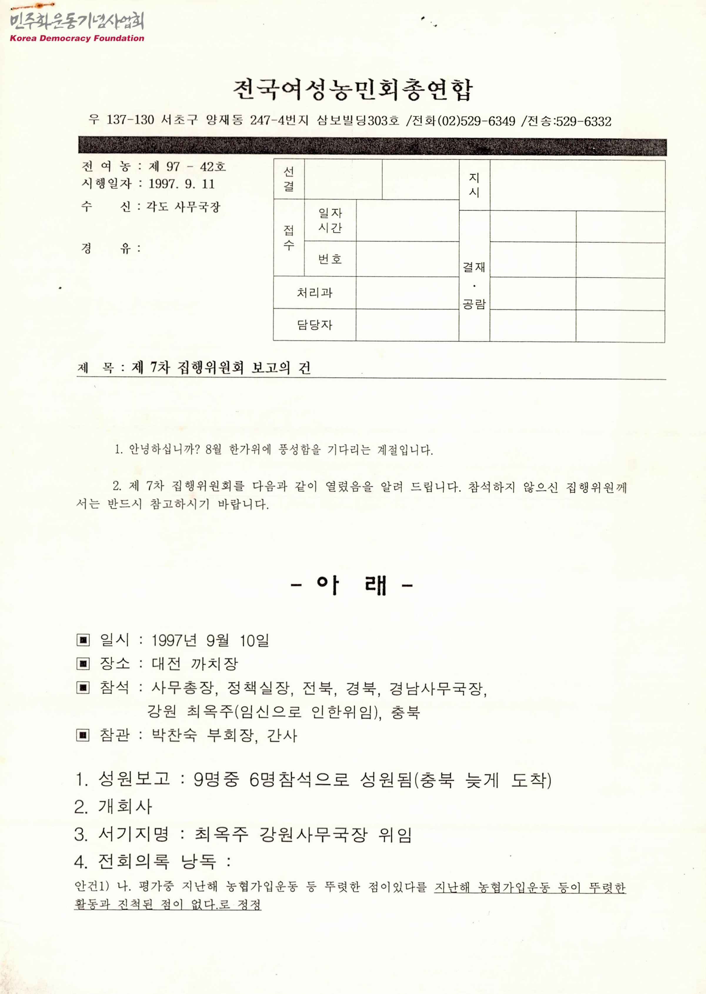- 각도의 전국여성농민회 사무총장에게 보내는 제7차 집행위원회 보고문으로 목차는 다음과 같음 1. 성원보고 2. 개회사 3. 서기지명 4. 전회의록 낭독 5. 활동보고 안건토론 안건1. 하반기 투쟁일정 점검의 건 안건2. 정무2실 지원사업 안건3. 여성농민, 세바여 평가와 발전방향 수립의 건 안건4. 세바여 기획안 수정 점검의 건 안건5. 농업인의 날 참여의 건 안건6. 기타안건