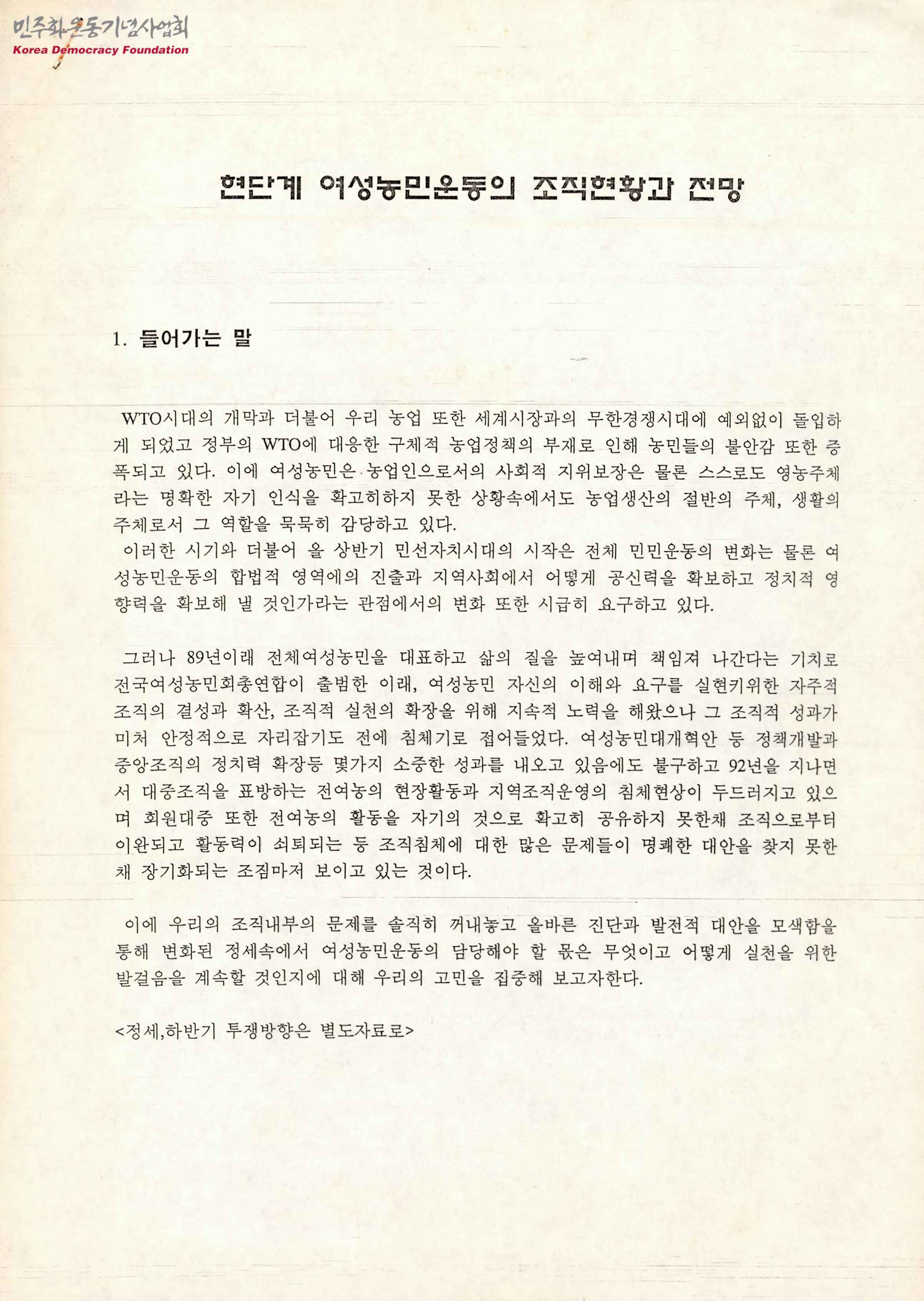 - 전국여성농민회총연합 내부 문제의 진단과 발전적 대안을 모색하는 문서로, 다음과 같은 내용이 수록되어 있음 1, 들어가는 말 2. 현단계 여성농민운동의 조직현황 - 전여농 조직현황과 진단 3. 여성농민운동의 전망과 조직활동의 과제 4. 조직과제 실천을 위해 노력할 것들