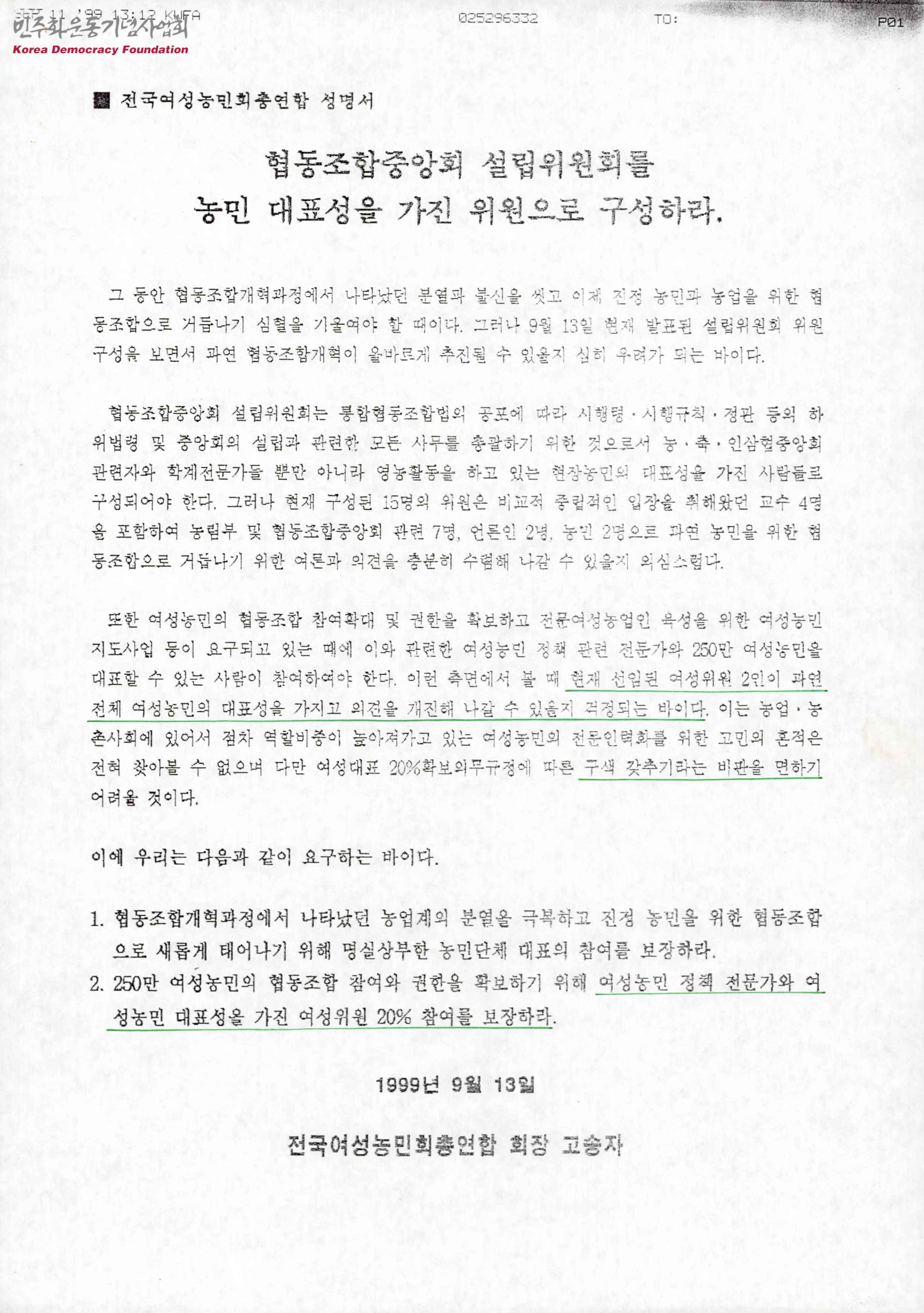 - 협동조합개혁과정에서 나타났던 농업계의 분열을 극복하고 농민을 위한 협동조합으로 태어나기 위해 농민단체 대표의 참여를 보장하라는 것, 여성농민 정책 전문가와 여성농민 대표성을 가진 여성위원 20%의 참여를 보장하라 등의 주장이 적힌 전국여성농민회총연합 성명서