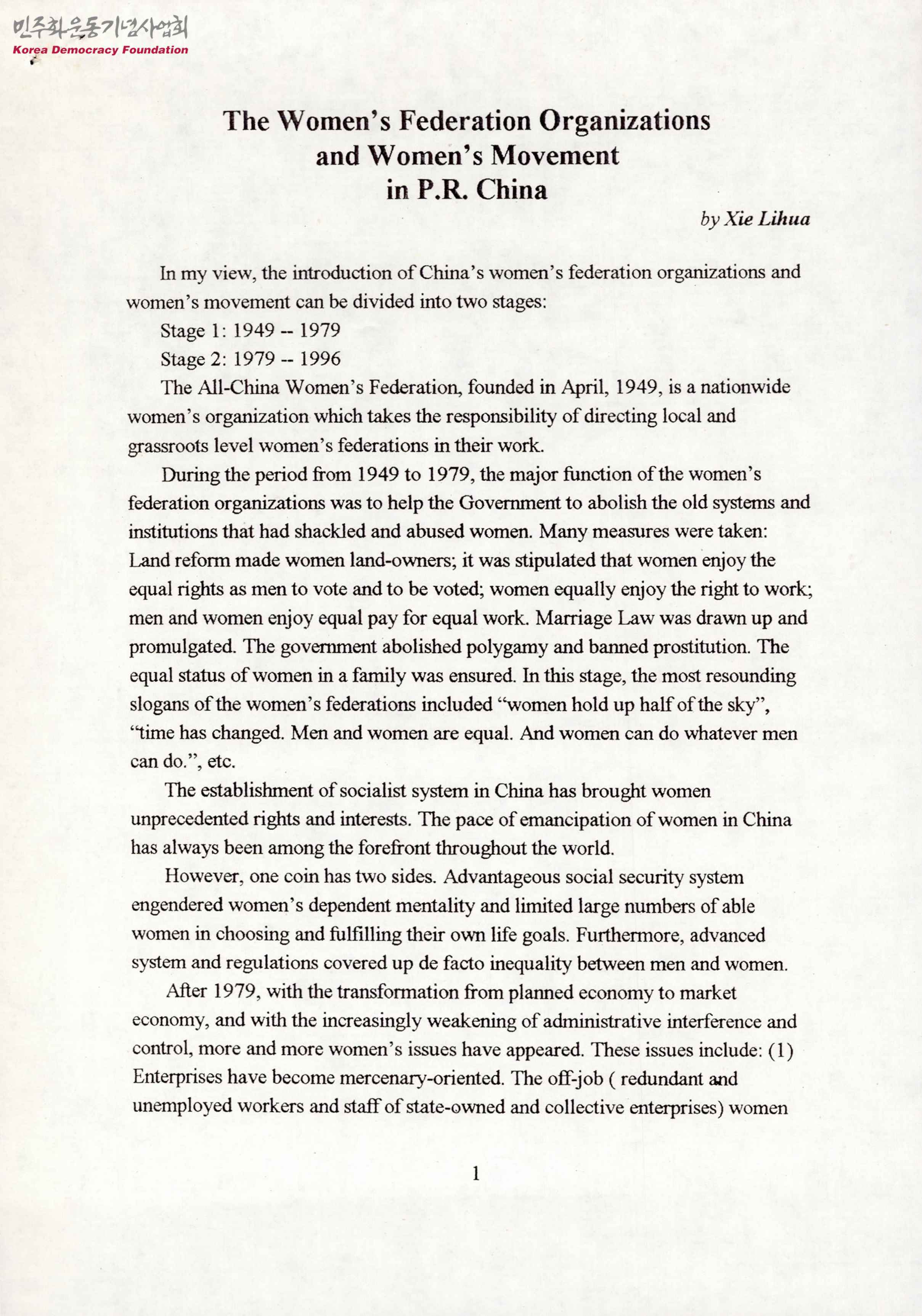 - 중국의 여성연맹조직과 여성운동 도입에 대한 문서로 1949년 설립된 전국여성연맹이 여성을 족쇄로 채우고 학대한 오래된 제도를 폐지하고 이뤄낸 일, 사회주의 체제가 확립되고 나서의 여성문제, 개방개혁 정책 이후의 여성문제에 대해 서술하고 이를 극복하기 위한 여성권익보장법의 정책입안, 여성법 정책 집행에 효과적인 시도, 비직장 여성근로자 재취업 사업의 시행 등의 조치를 취할것을 주장하는 문서