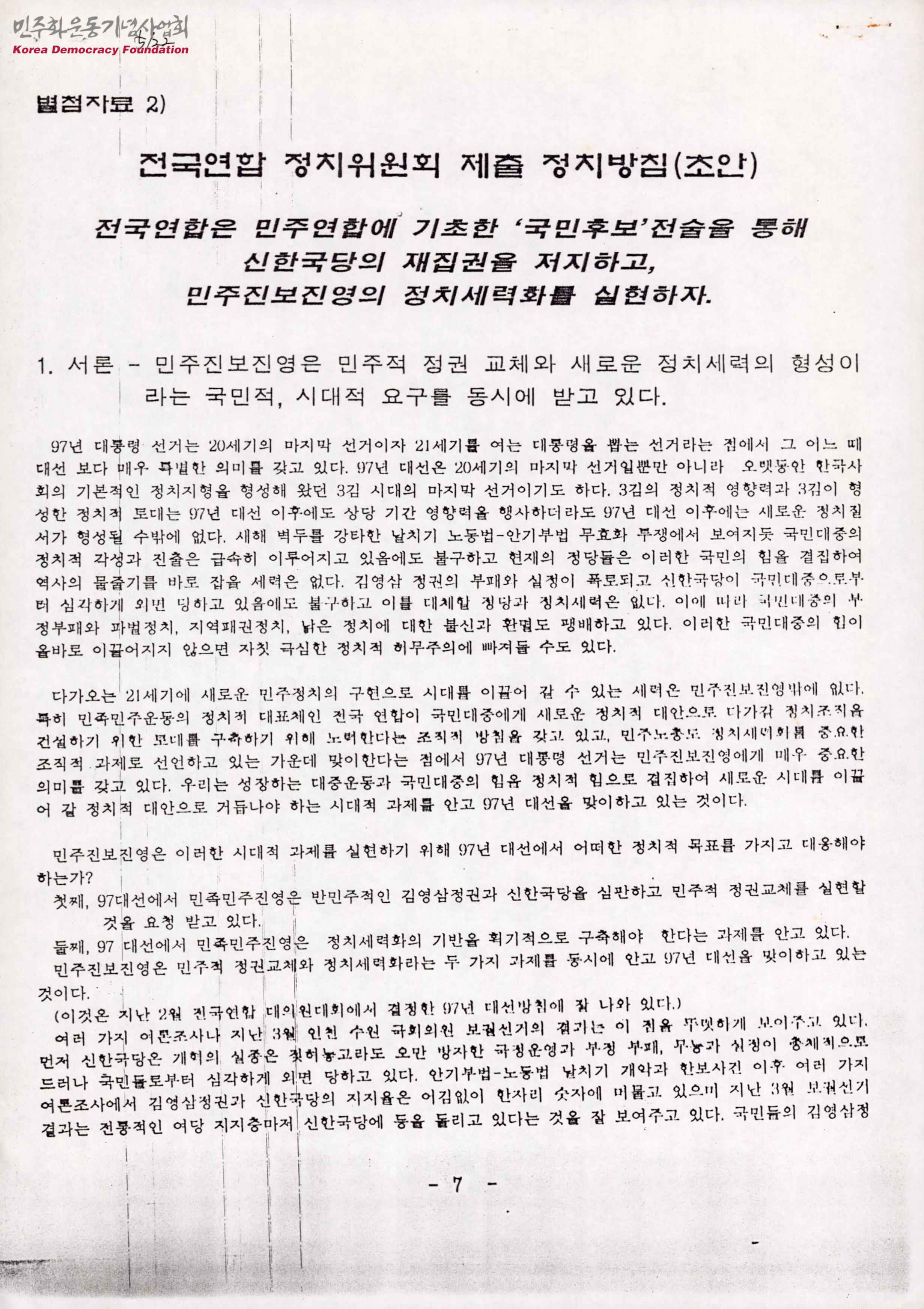 - 국민후보'전술을 통해 신한국당의 재집권을 저지하고 민주진보진영의 정치세력화를 실현하기 위한 정치방침으로 목차는 다음과 같음 1. 서론 - 민주진보진영은 민주적 정권 교체와 새로운 정치세력의 형성이라는 국민적, 시대적 요구를 동시에 받고 있다. 2. 민주진보진영은 기종의 정치지형과 대선구도의 변화를 주도해야 한다. 3. 민주진보진영은 97 대선에서 '우리 후보'를 갖고 적극 참여해야 한다. 4. <반신한국당, 반보수야합>의 기치 아래 민족민주운동이 주도하는 새로운 민주연합전선을 구축하자. 5. '우리 후보'는 민주연합전선을 대표하는 '국민후보'이다. 6. 대중투쟁과 선거투쟁을 긴밀히 결합해야 한다. 7. 민족민주운동의 일치된 단결만이 승리를 보장한다. 8. 전국연합은 빠른 시일 내에 구체적인 대선방침을 확정해야 한다.