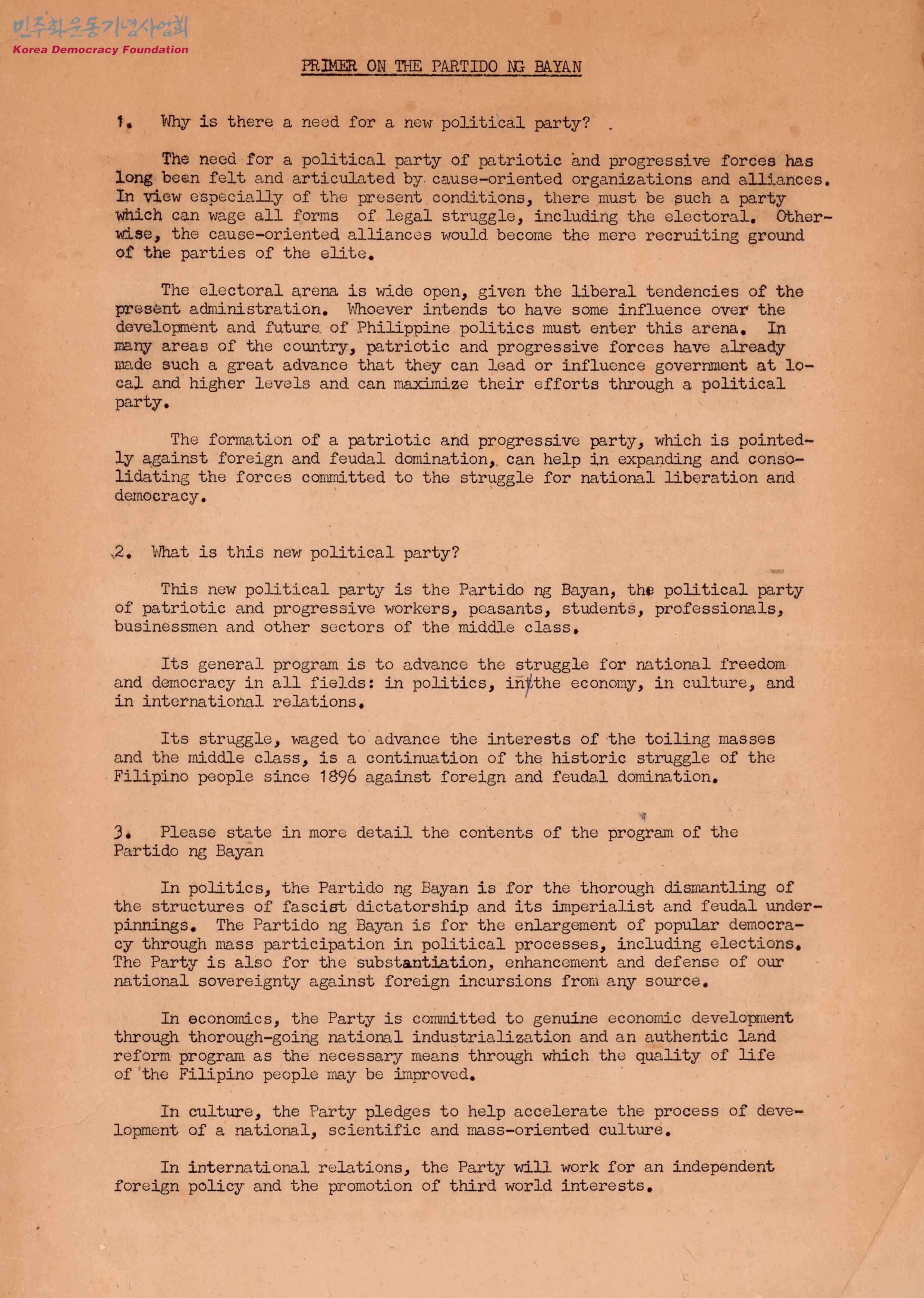 - 바얀당에 대한 질문이 담긴 기본지침서로 목차는 다음과 같음 1. Why is there a need for a new political party?(왜 새로운 정당이 필요한가?) 2. What is this new political party?(이 새로운 정당은 무엇입니까?) 3. Please state in more detail the contents of the program of the Partido ng Bayan(바얀당의 프로그램 내용을 좀 더 자세히 설명해 주세요) 4. What are the main activities of the Party?(당의 주요 활동은 무엇입니까?) 5. How different is the Partido ng Bayan from other political parties?(바얀당은 다른 정당과 얼마나 다른가요?) 6, How different is the Partido ng Bayan from cause-oriented organizations like Bayan?(바얀당은 같은 원인 지향적인 조직과 얼마나 다른가?) 7. What are the chances of the Partido ng Bayan's surviving under present conditions?(현재 상황에서 바얀당이 살아남을 가능성은 얼마나 됩니까?) 8. What is the relationship between the Partido ng Bayan with the Aquino goverment?(바얀당과 아키노 정부는 어떤 관계입니까?)