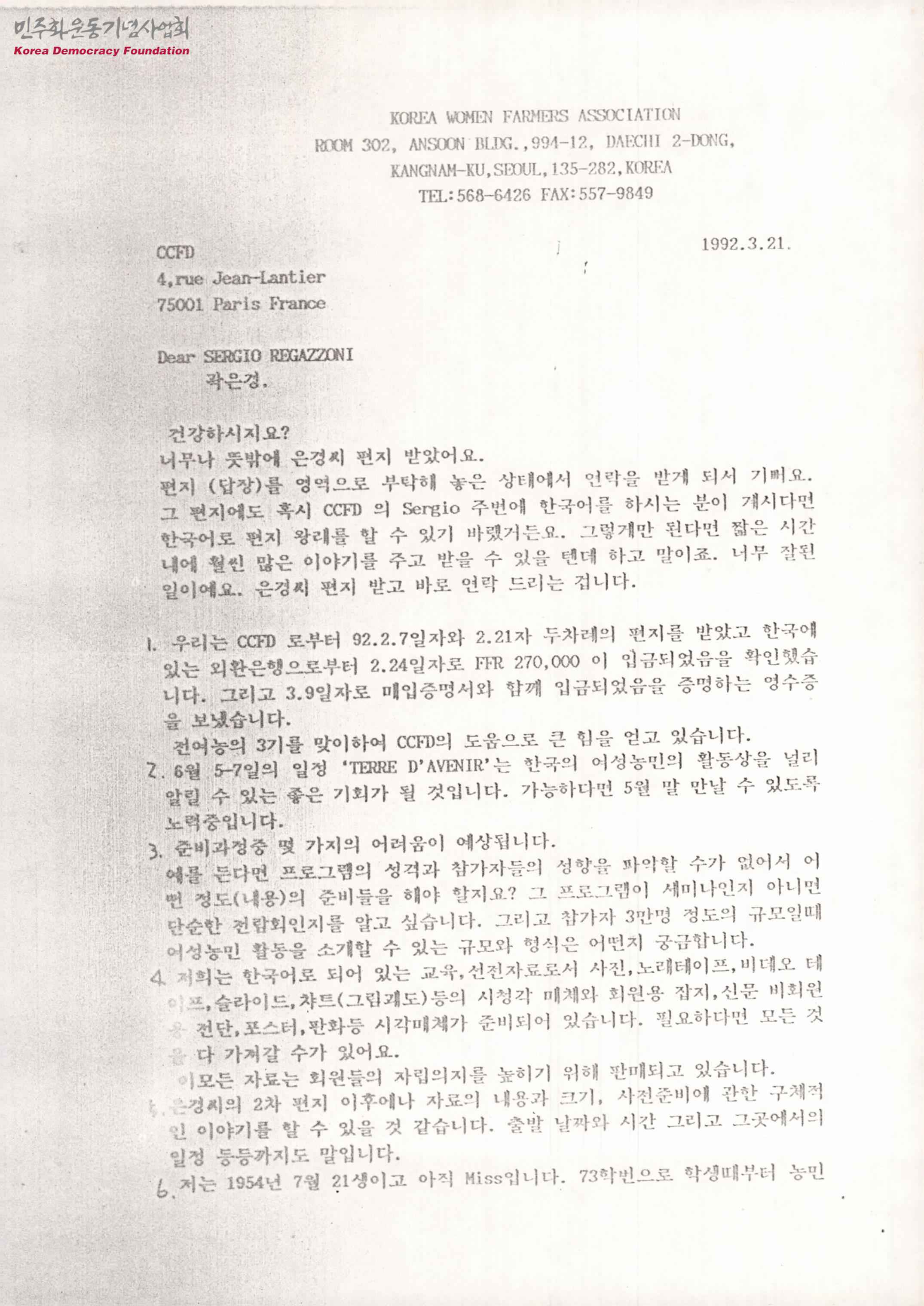 - 박성자가 곽은경에게 보내는 편지로, CCFD로부터의 지원에 대한 감사, 'TERRE D'AVENIR' 발표 준비에 관한 질문 등의 내용을 다룸