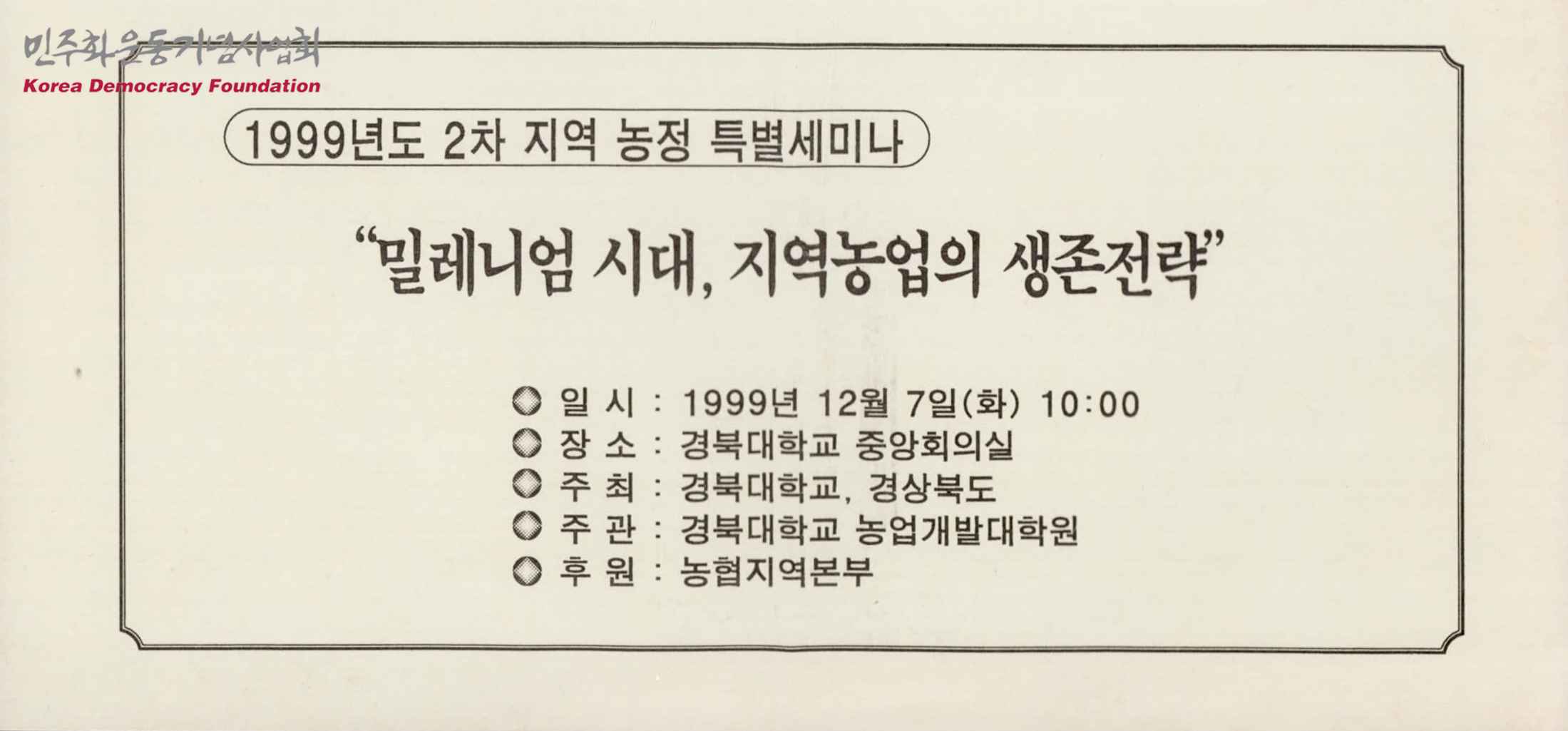 - 99년 12월 7일 진행되는 세미나 "밀레니엄 시대, 지역농업의 생존전략"의 초대장으로 세미나의 순서와 경북대본관의 약도 등이 실려 있음