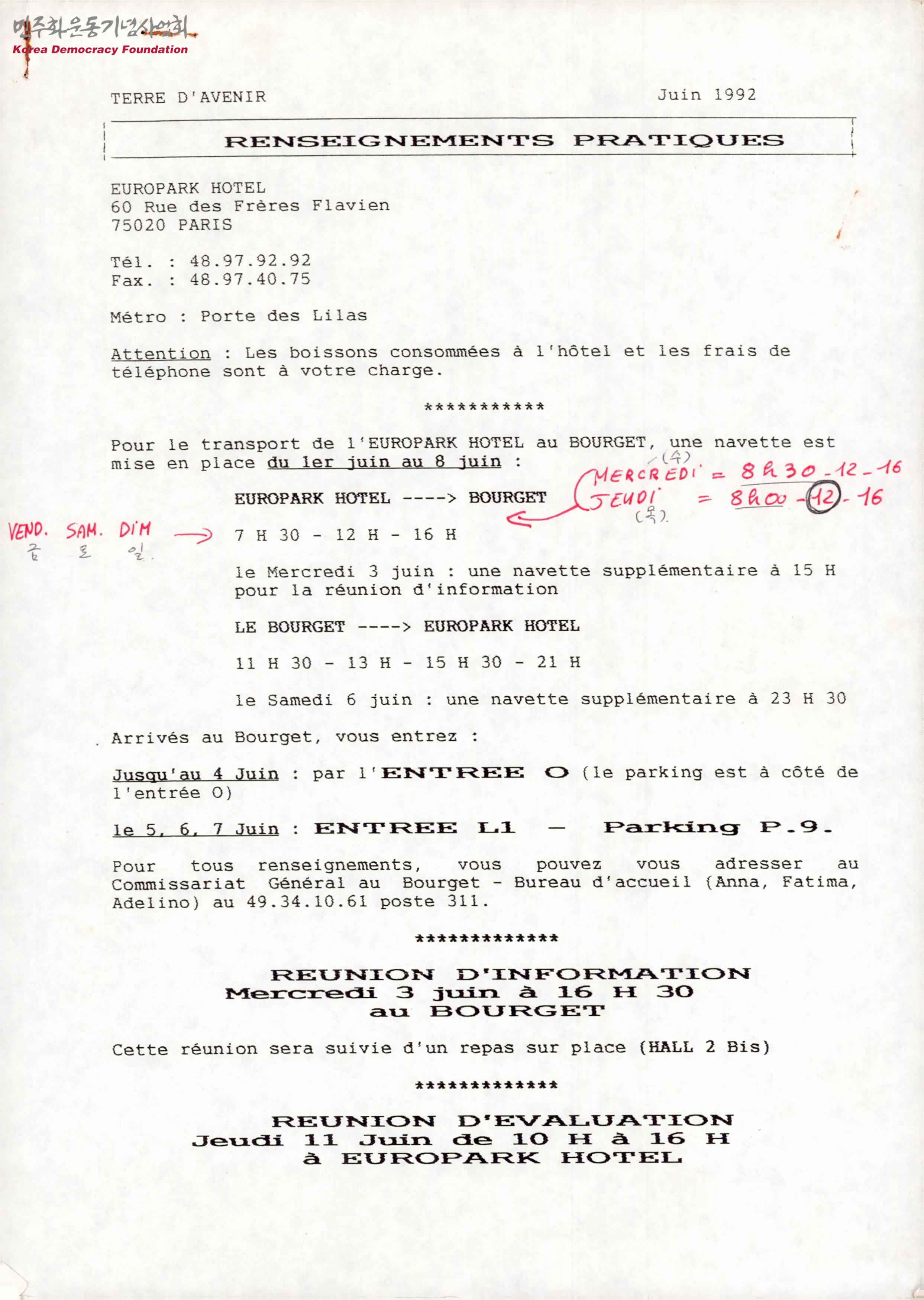 - Terre d'Avenir에서 진행하는 포럼 관련 안내 문서들로 호텔과 챙겨야할 짐에 대한 안내문과 포럼을 마치고 제출할 소감문 양식 등이 첨부되어 있음
