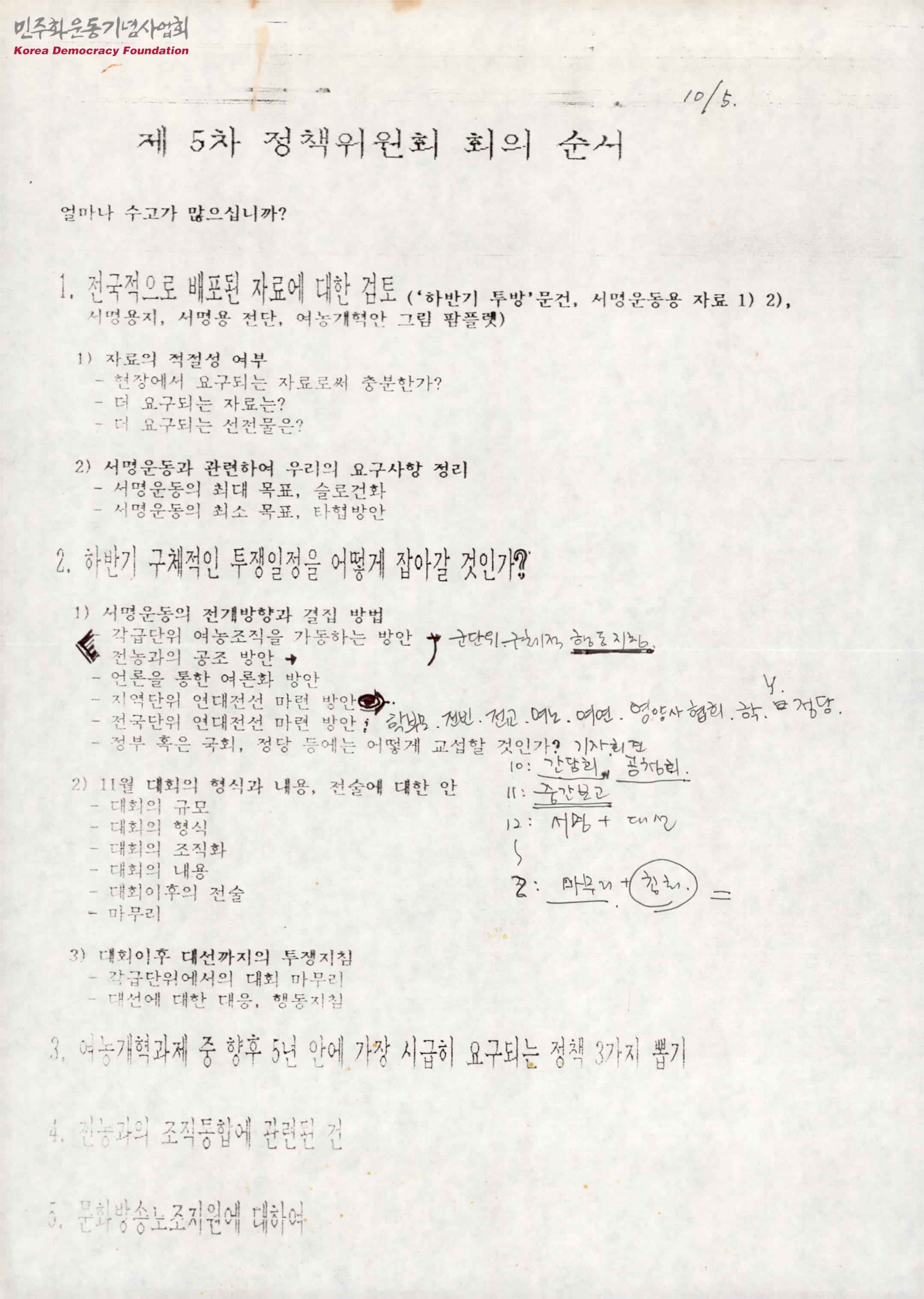 - 전국여성농민회총연합의 제5차 정책위원회 회의 순서를 작성한 문서로 '전국적으로 배포된 자료에 대한 검토', '하반기 구체적인 투쟁일정을 어떻게 잡아갈 것인가?', '여농개혁과제 중 향후 5년 안에 가장 시급히 요구되는 정책 3가지 뽑기' 등의 내용을 수록하고 있음