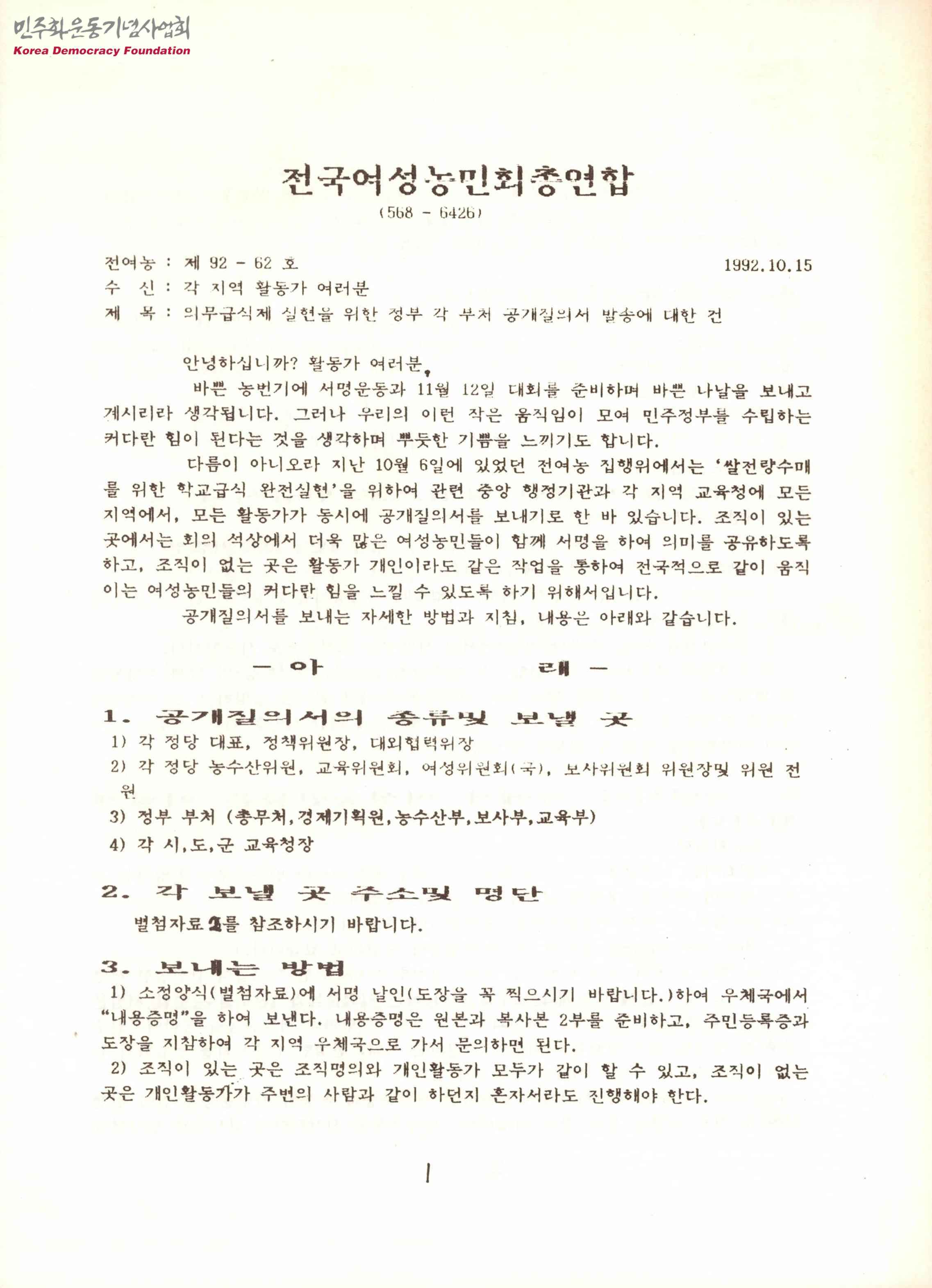 - 전국여성농민회총연합에서 작성한 의무급식제 실현을 위한 정부 각 부처 공개질의서 발송에 대한 문서로 '쌀전량수매와 학교급식실현 92전국여성농민대회에 관한 보고 및 제안서', '장관 및 의원 등에게 보내는 질의서' 등의 내용을 수록하고 있음