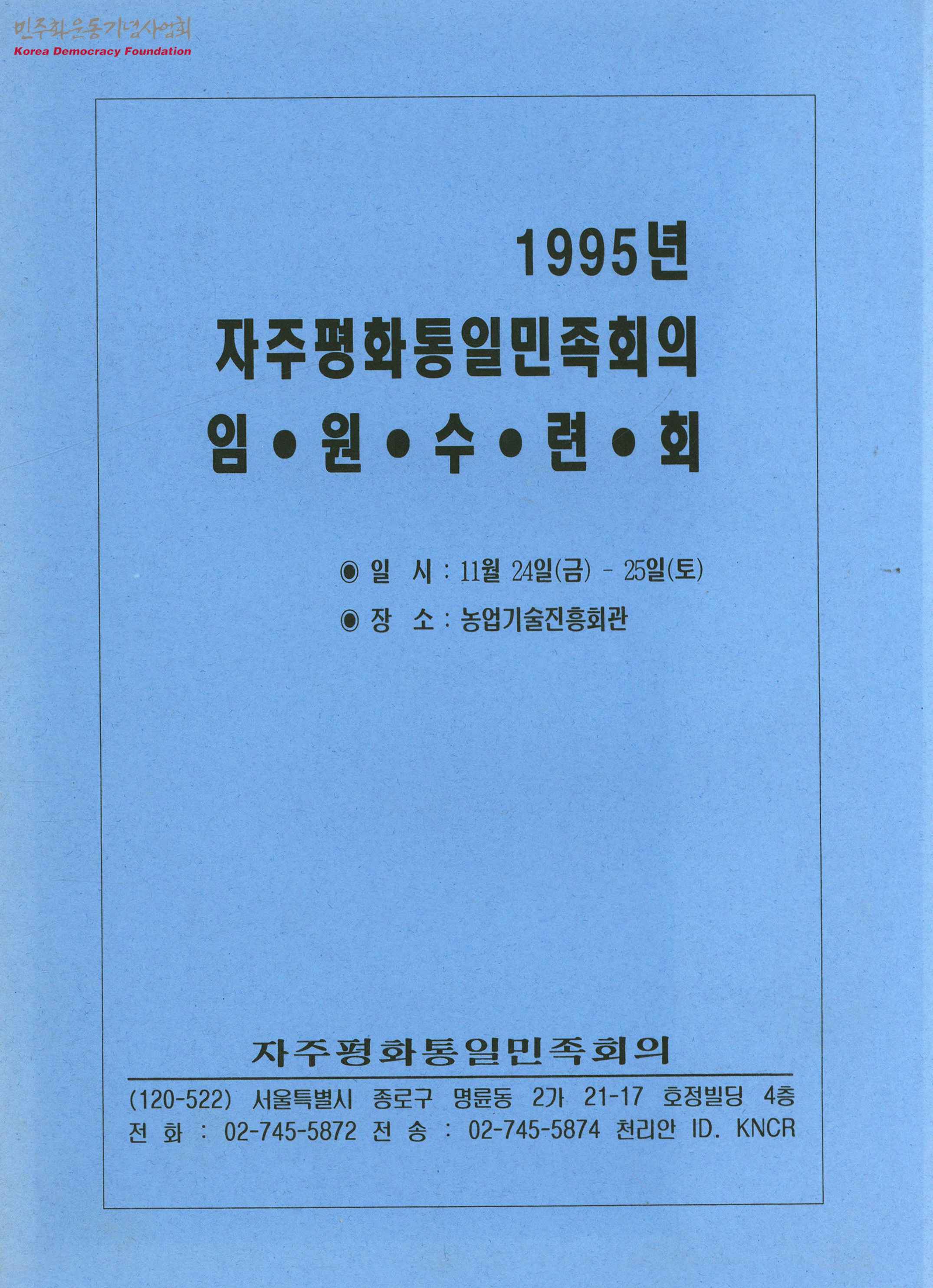 - 1995년 자주평화통일민족회의 임원수련회 자료집으로 임원 수련회의 일정과 자주평화통일민족회의 대의원대회 공고, 사무실 이전공고 등이 수록됨