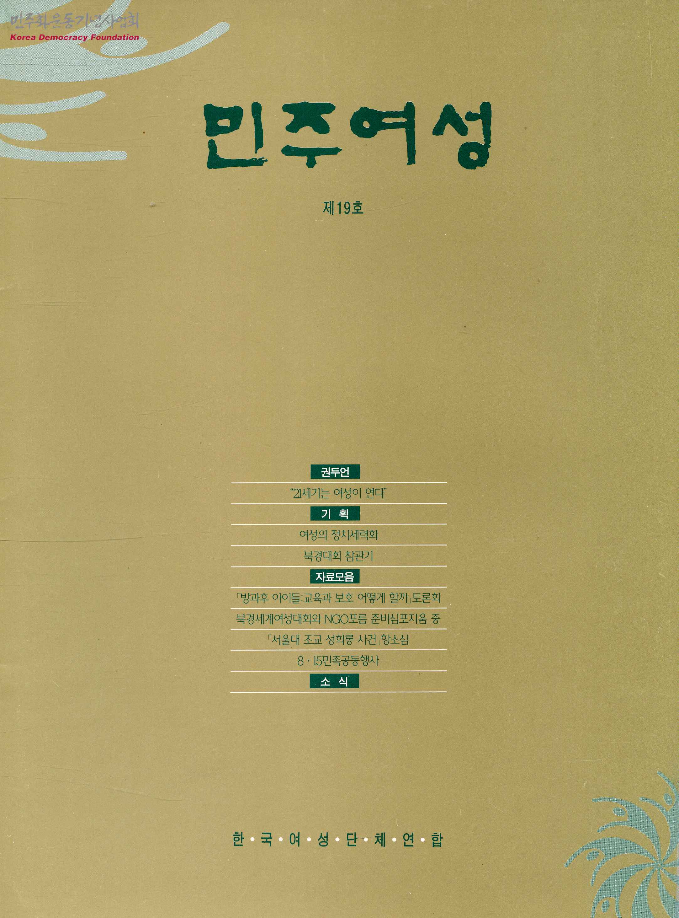 - 민주여성 제19호 간행물로 주요목차는 다음과 같음 - 권두언 : "21세기는 여성이 연다" - 기획 여성의 정치세력화 북경대회 참관기 - 자료모음 「방과후 아이들 교육과 보호 어떻게 할까」 토론회 북경세계여성대회와 NGO 포름 준비심포지움 중 「서울대 조교 성희롱 사건」항소심 8·15 민족공동행사 - 소식
