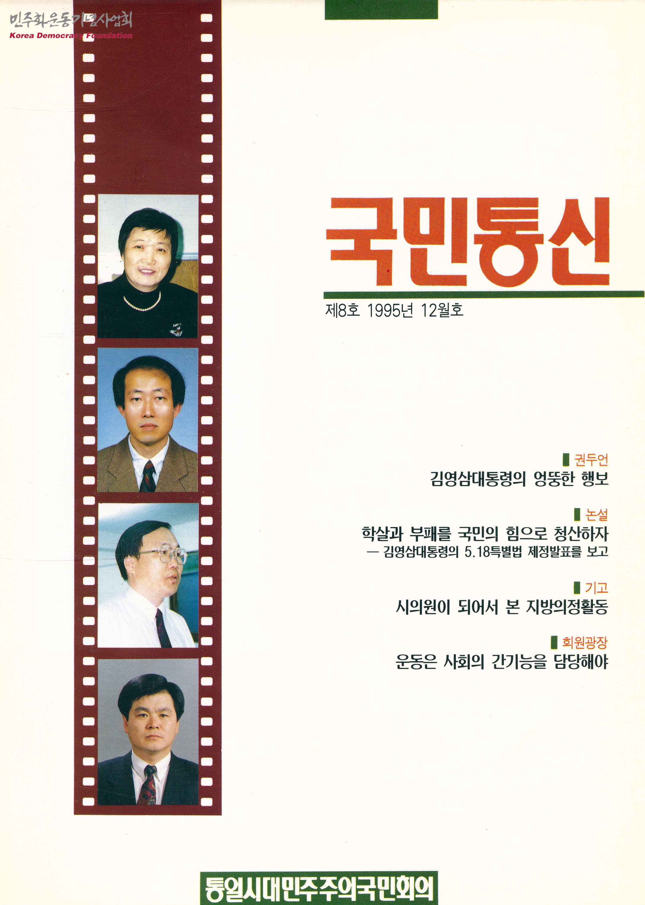 - 통일시대민주주의국민회의 간행물로, 다음과 같은 내용 등이 수록됨 권두언 / 김영삼 대통령의 엉뚱한 행보 논설 / 학살과 부패를 국민의 힘으로 청산하자 - 김영삼 대통령의 5.18 특별법 제정발표를 보고 기고 / 시의원이 되어서 본 지방의정활동 회원광장 / 운동은 사회의 간 기능을 담당해야
