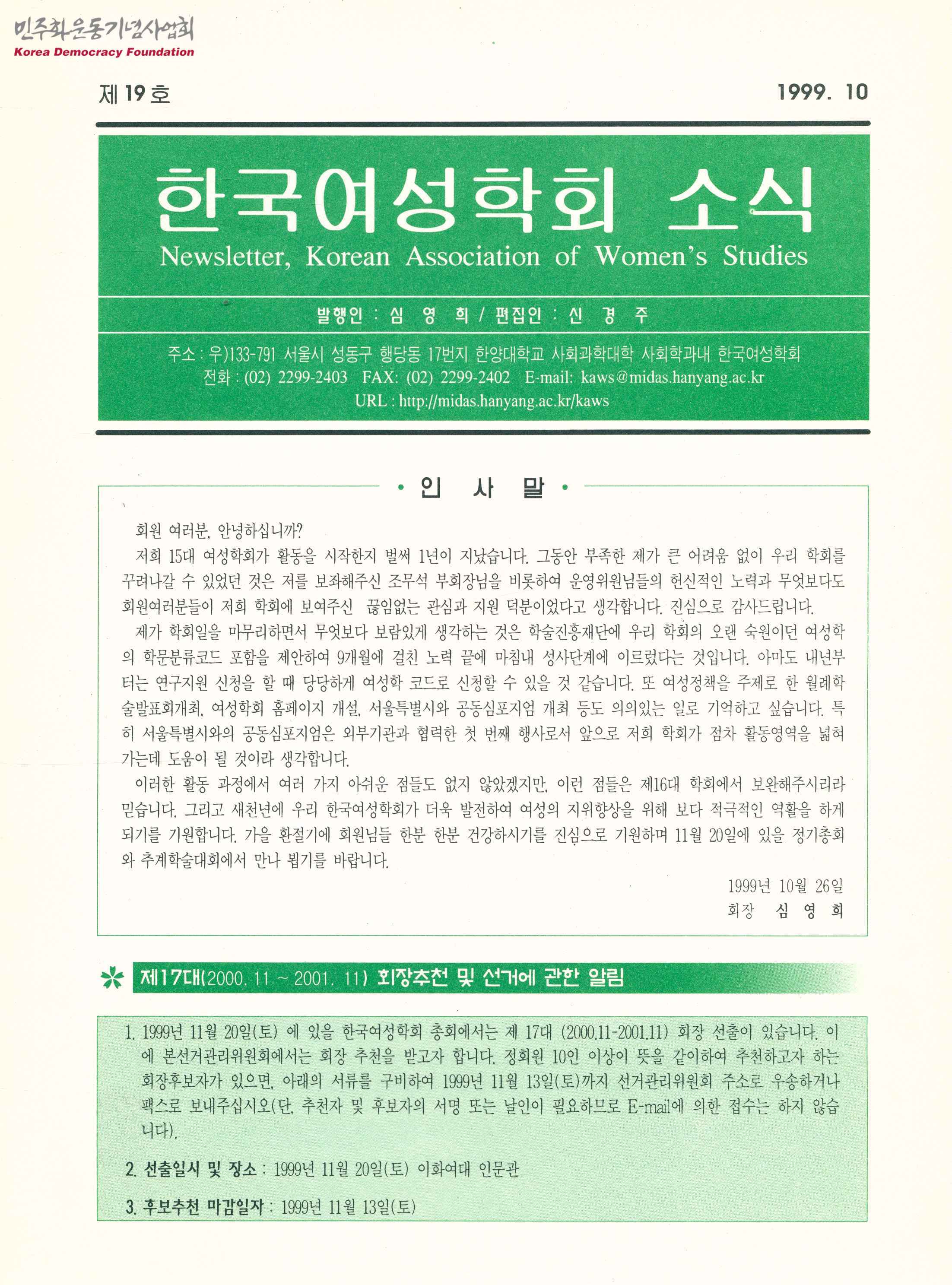 - 한국여성학회에서 발행한 <한국여성학회 소식> 제19호로 15대 여성학회 회장 심영희의 인사말과 학회의 활동보고, 1999년도 정기총회 및 추계학술대회에 대한 안내 등이 실려 있음