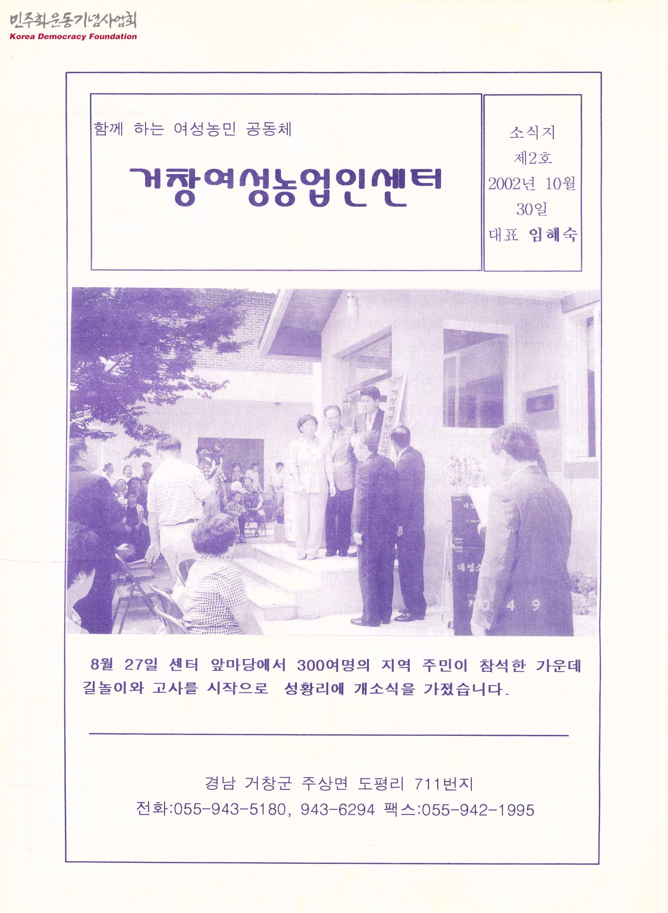 - 거창여성농입인센터에서 발행한 소식지 제2호로 센터대표 임혜숙의 인사말과 '우리 콩 축제'의 일시와 정보화 교육, 쌀 직거래 사업의 실시 등의 알림 등이 실려 있음