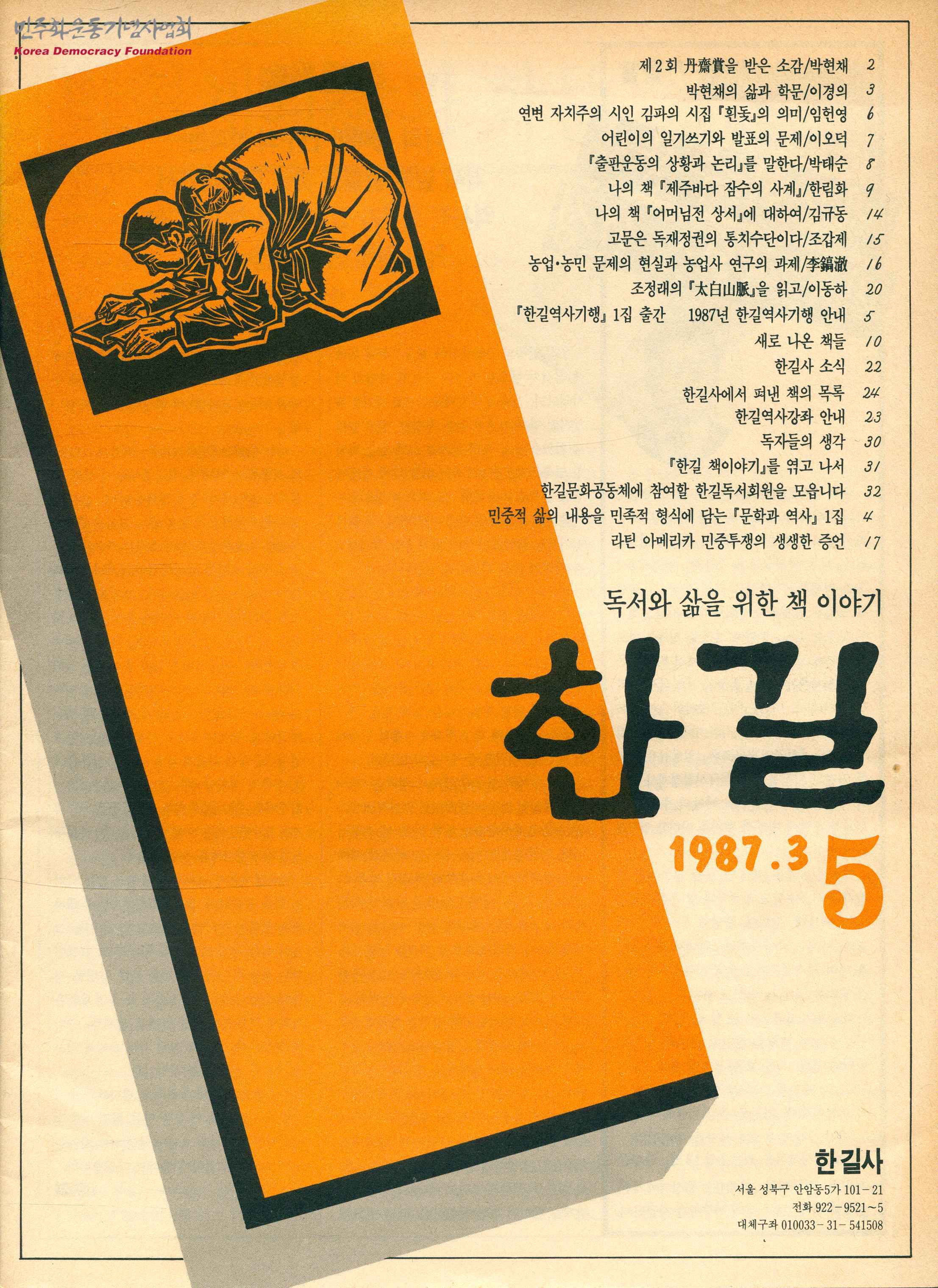 - 한길사에서 발행한 <한길> 5호로 아래와 같은 목차 등으로 구성되어 있음 - 제2회 단재상을 받은 소감/박현채 - 박현채의 삶과 학문/이경의 - 어린이의 일기쓰기와 발표의 문제/이오덕 - 고문은 독재정권의 통치수단이다/조갑제