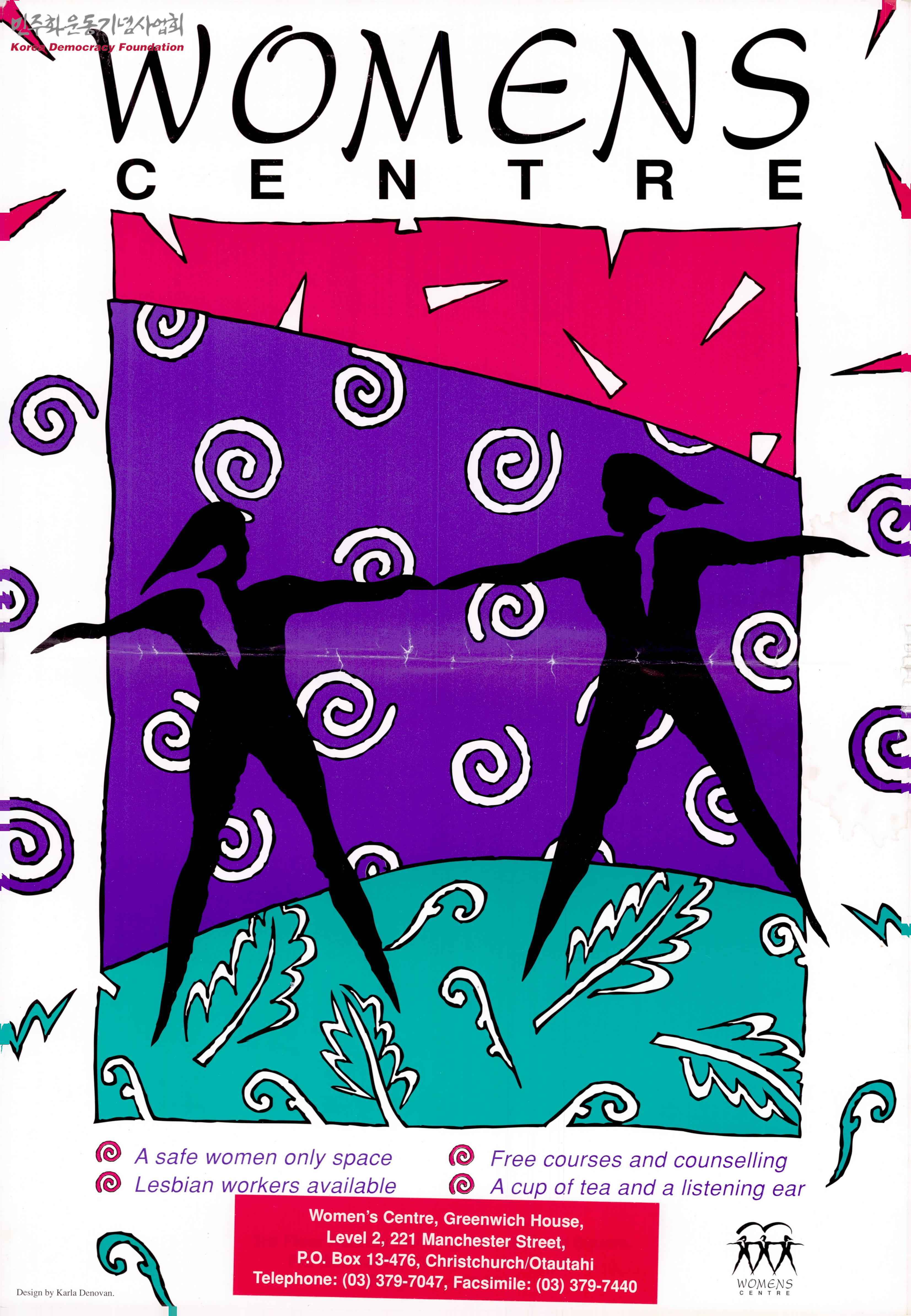 - 여성센터의 홍보 포스터로 안전한 여성 공간이며 레즈비언 노동자도 사용 가능하다는 것, 무료로 상담과 강좌를 진행한다는 것 등이 적혀있음