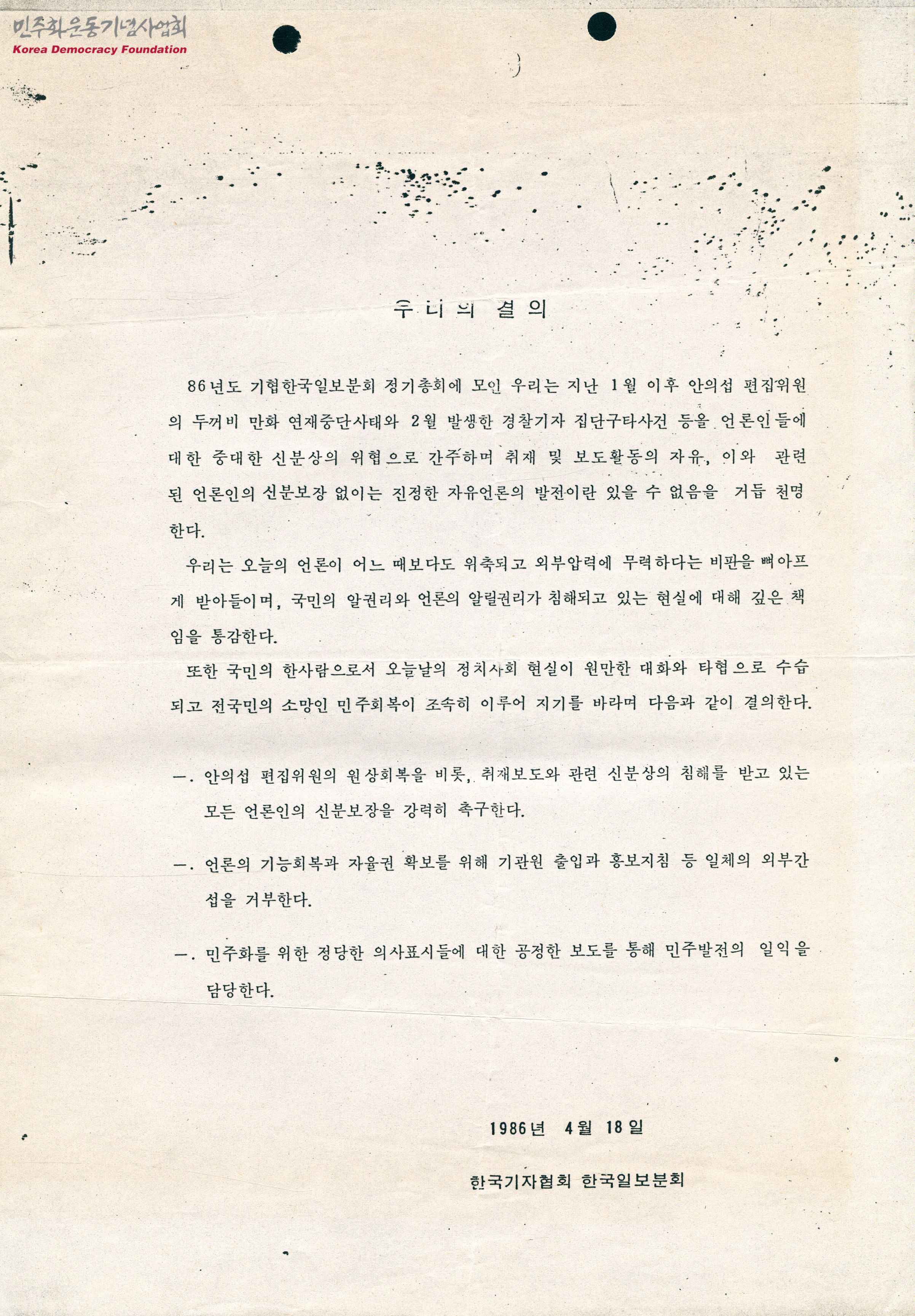 - 언론인의 신분보장 없이는 진정한 자유언론의 발전이란 있을 수 없다고 하며 안의섭 편집위원의 원상회복, 언론인의 신분보장 촉구, 외부간섭 거부, 민주화를 위한 정당한 의사표시들에 공정한 보도를 통해 민주발전의 일익을 담당한다는 등의 결의가 적힌 문서
