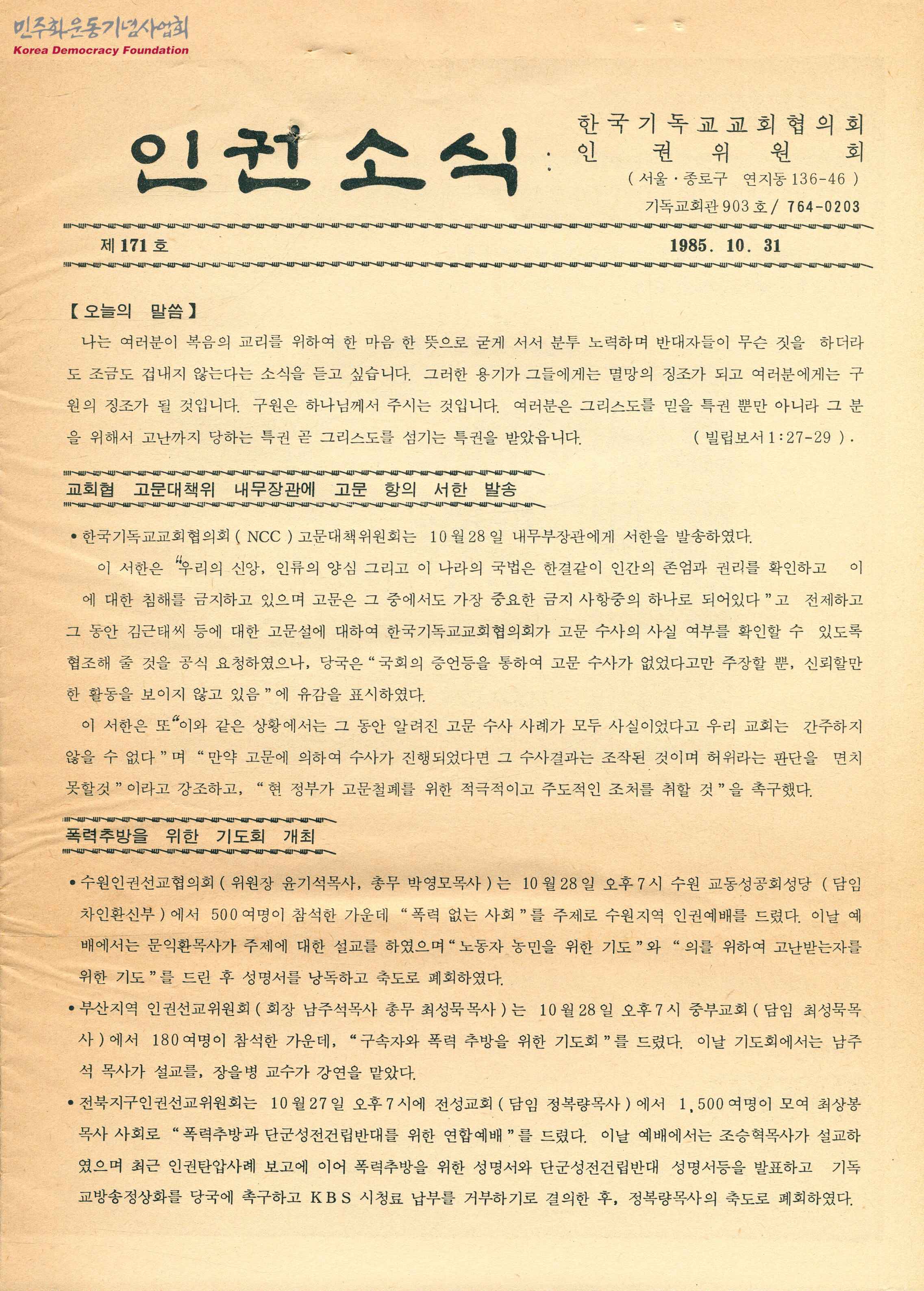 - 폭력추방을 위한 기도회를 개최했다는 글, 민주화추진위원회 사건 발표 관련 글, 김근태가 기소되었다는 글 등이 수록