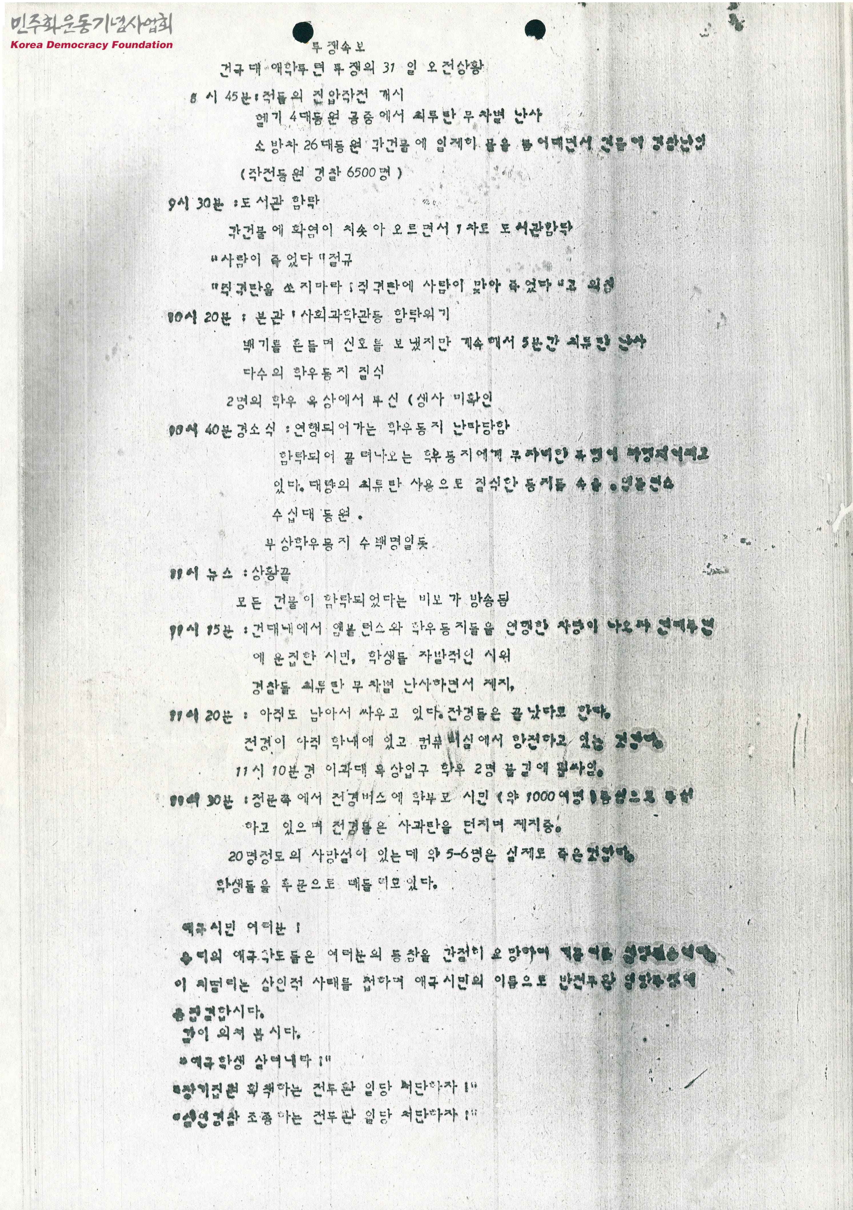 - 건국대학교 전국 반외세 애국학생 투쟁연합의 31일 오전상황의 투쟁속보로, 전두환 정권의 폭력진압에 학생의 투신, 점거 건물의 함락 등의 내용 등을 다룸