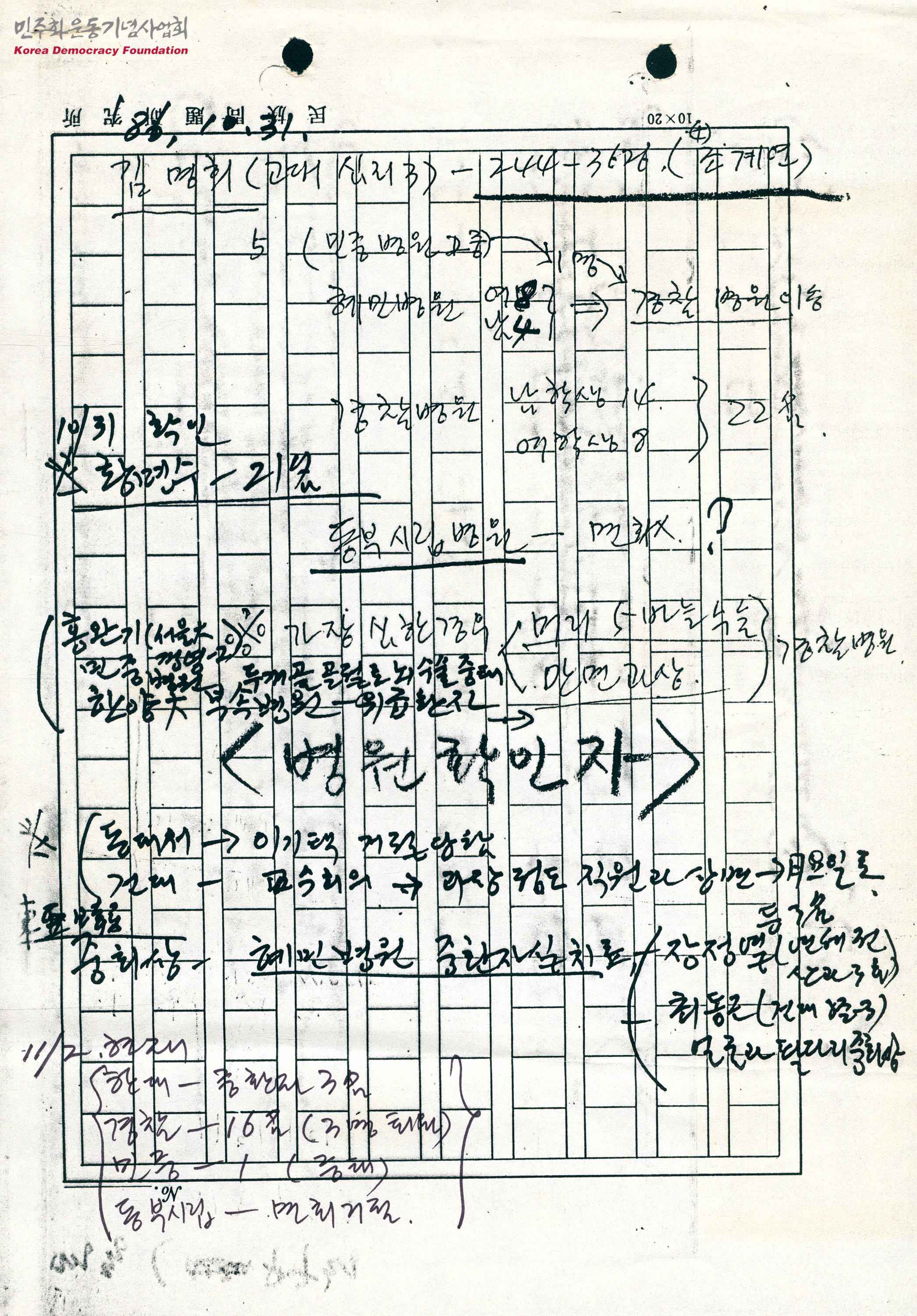 - 10.28 건대연합농성 사건에서 병원으로 이송된 학생들의 내용을 다룬 메모