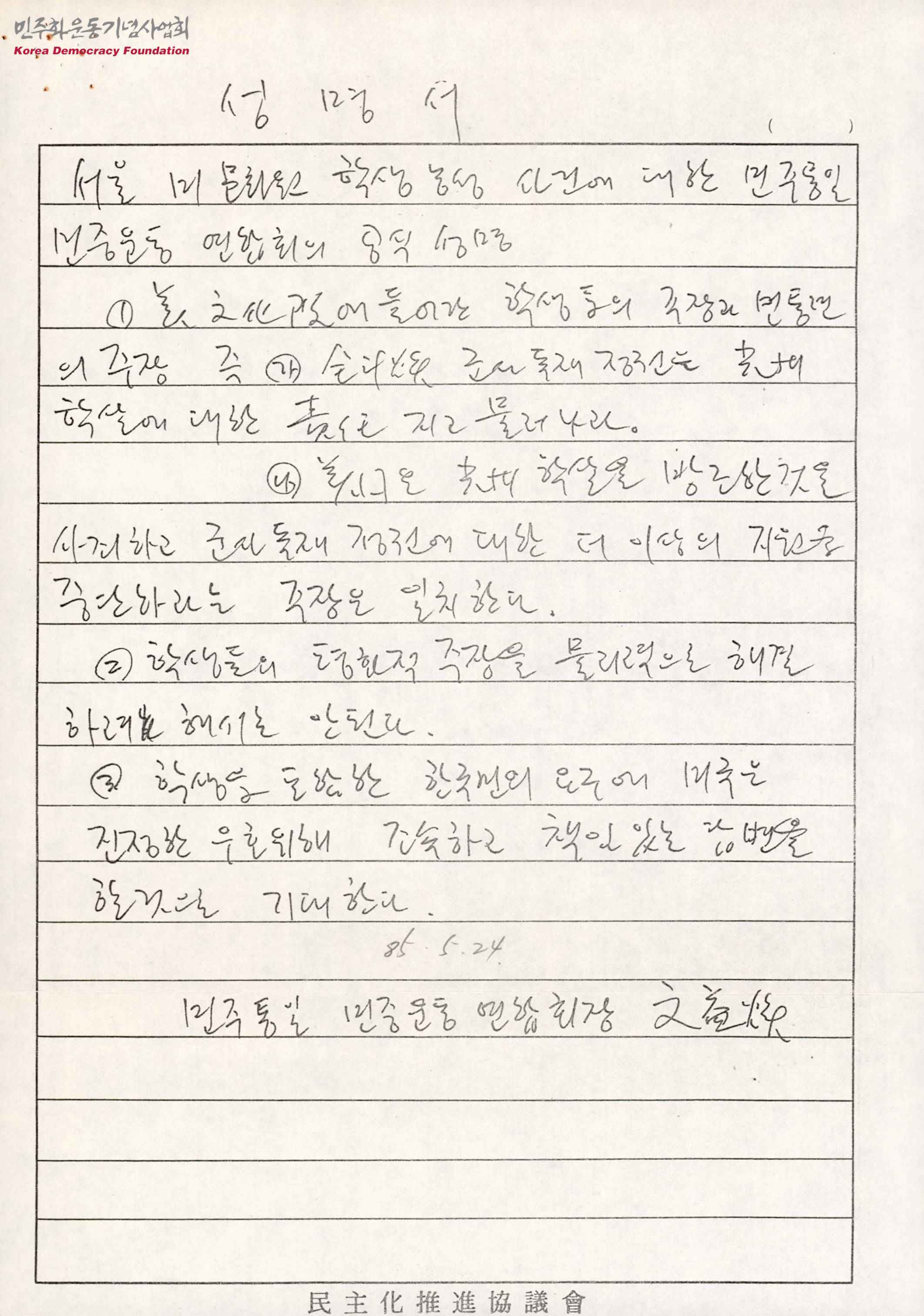 - 농성 중인 학생들의 전두환 퇴진과 미국의 광주학살 방조 사죄 주장은 민통련의 주장과 일치한다는 내용, 평화적인 주장의 물리적 해결 반대, 미국의 책임있는 답변을 기대한다는 등의 내용이 수록된 성명서