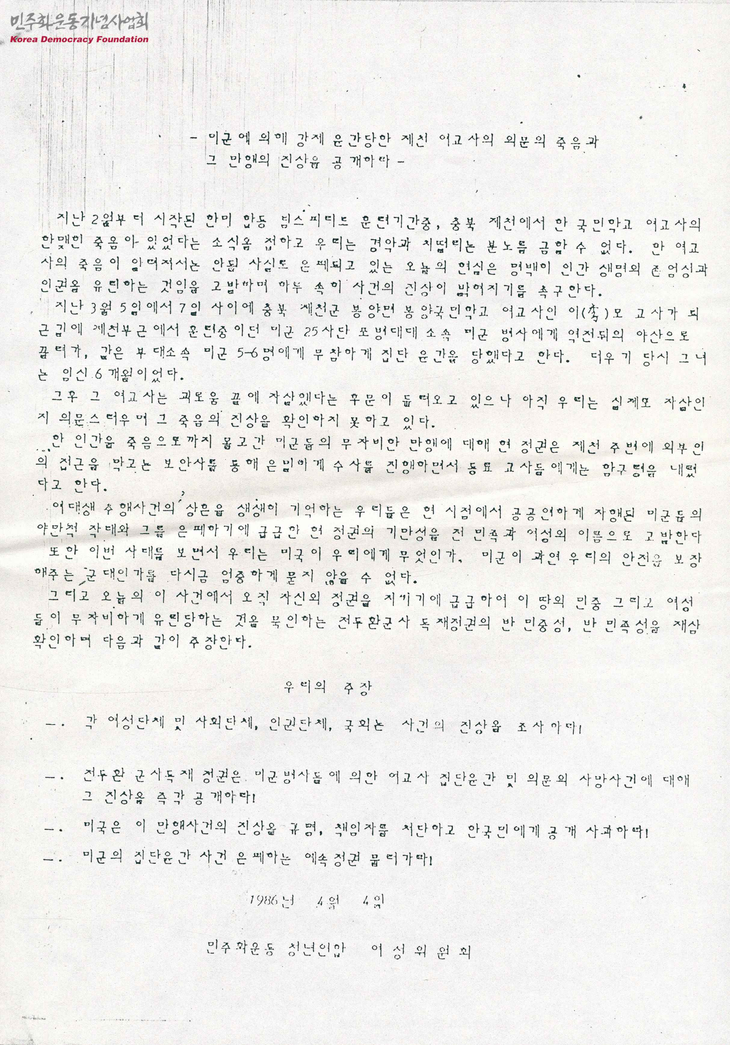 - 3월 5일부터 7일 사이 제천에서 여교사가 미군에게 윤간당한 사건 관련, 각 여성·사회·인권단체와 국회에 대한 진상조사, 전두환 정권의 진상 공개, 미국의 책임자 처벌과 공개 사과, 사건을 은폐하는 전두환 정권 폐지를 요구하는 내용 등을 다룸