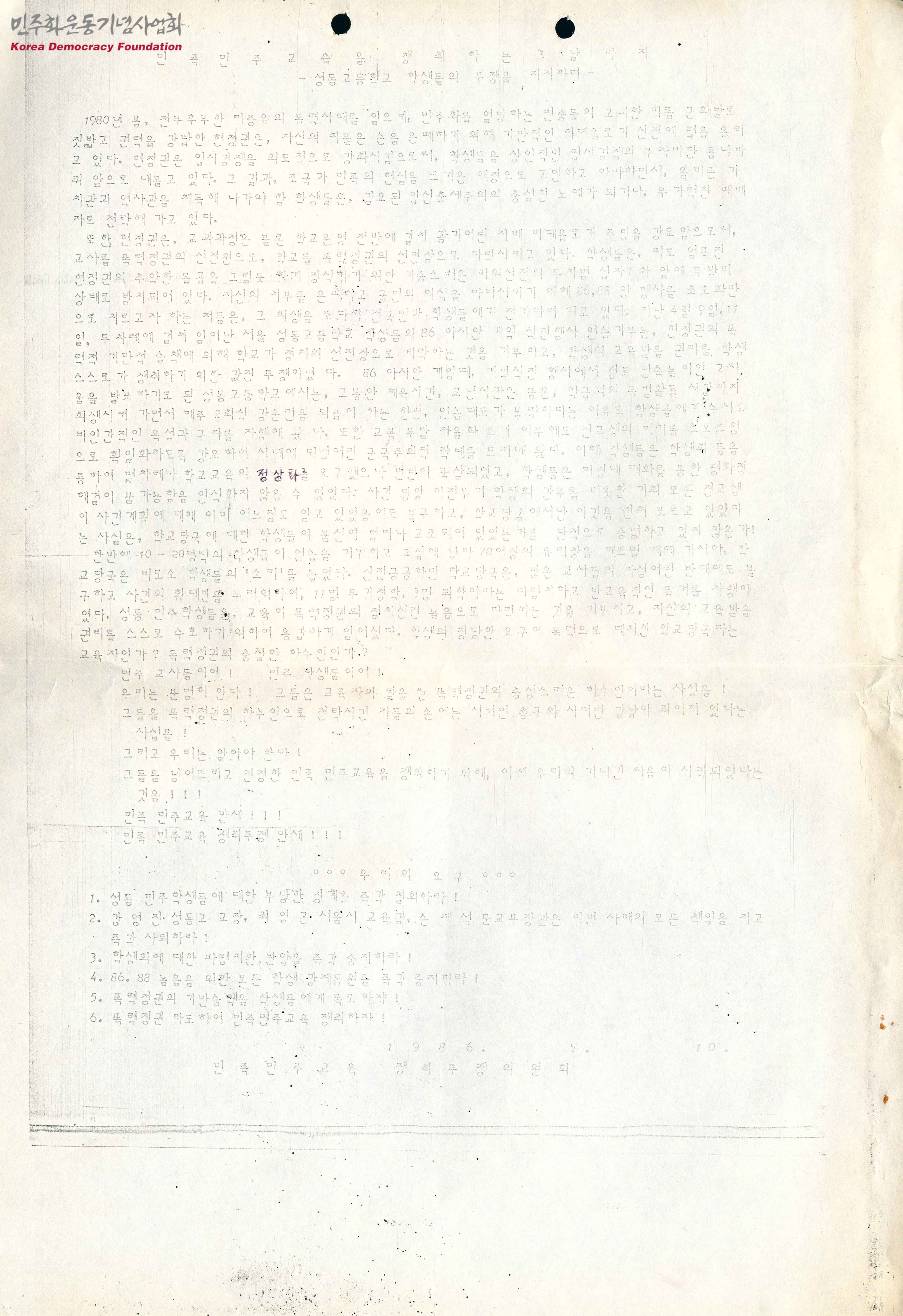 - 성동고등학교 학생들의 86아시안게임 식전행사 연습거부로 인한 징계조치에 대해 항의하는 성명서로 아래와 같은 요구사항과 구호가 담겨 있음 - 성동 민주학생들에 대한 부당한 징계를 즉각 철회할 것 - 강영진 성동고 교장, 최열곤 서울시 교육감, 손제석 문교부 장관은 이번 사태의 모든 책임을 지고 즉각 사퇴할 것 - 학생회에 대한 파렴치한 탄압을 즉각 중지할 것 - 86.88 놀음을 위한 모든 학생 강제동원을 즉각 중지할 것 - 폭력정권의 기만술책을 학생들에게 폭로하자 - 폭력정권 타도하여 민족민주교육을 쟁취하자