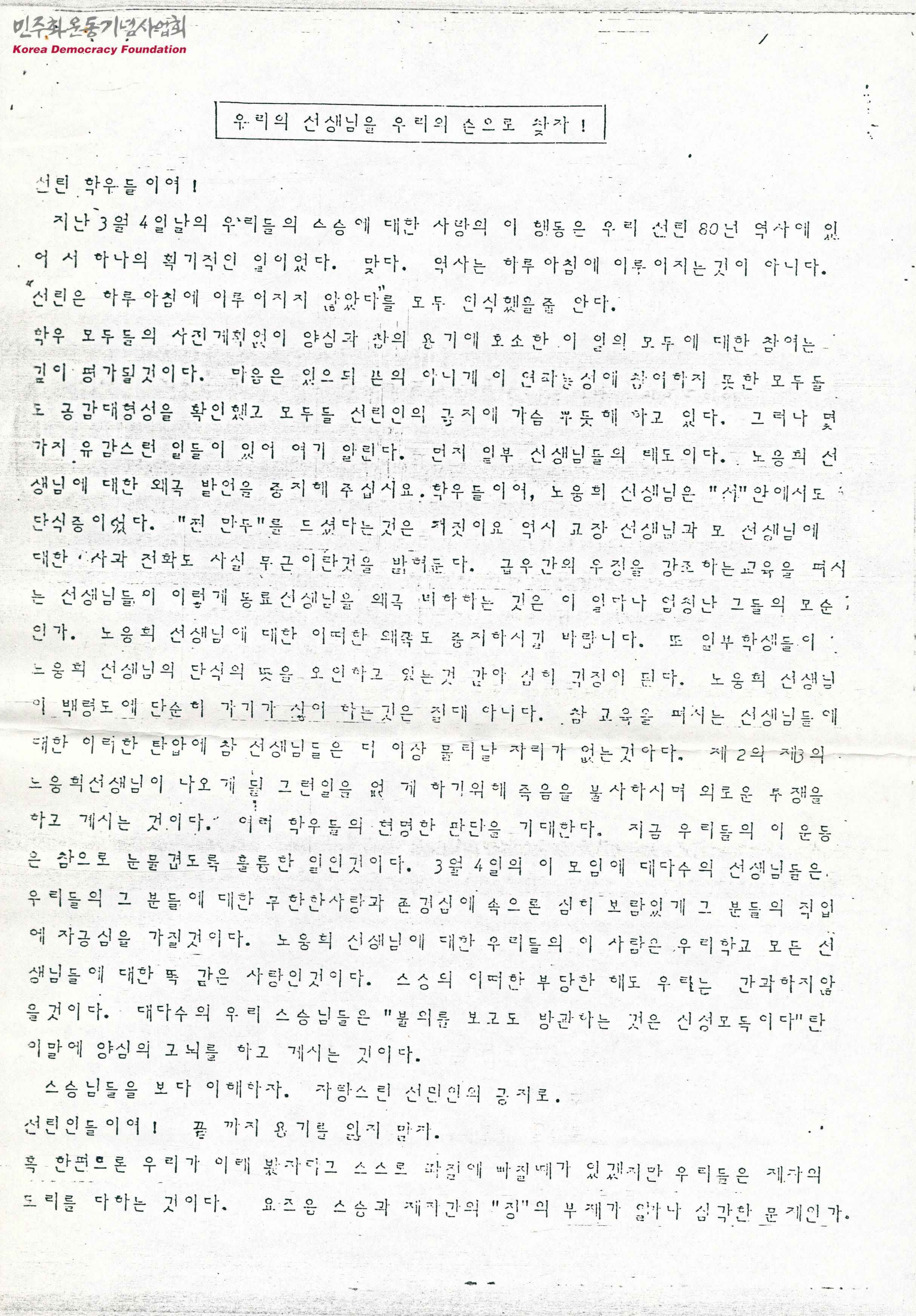 - 백령도로 타도전출 조치를 받아 단식농성 중인 노웅희에 대한 선린상고 학생들의 지지를 호소하는 글