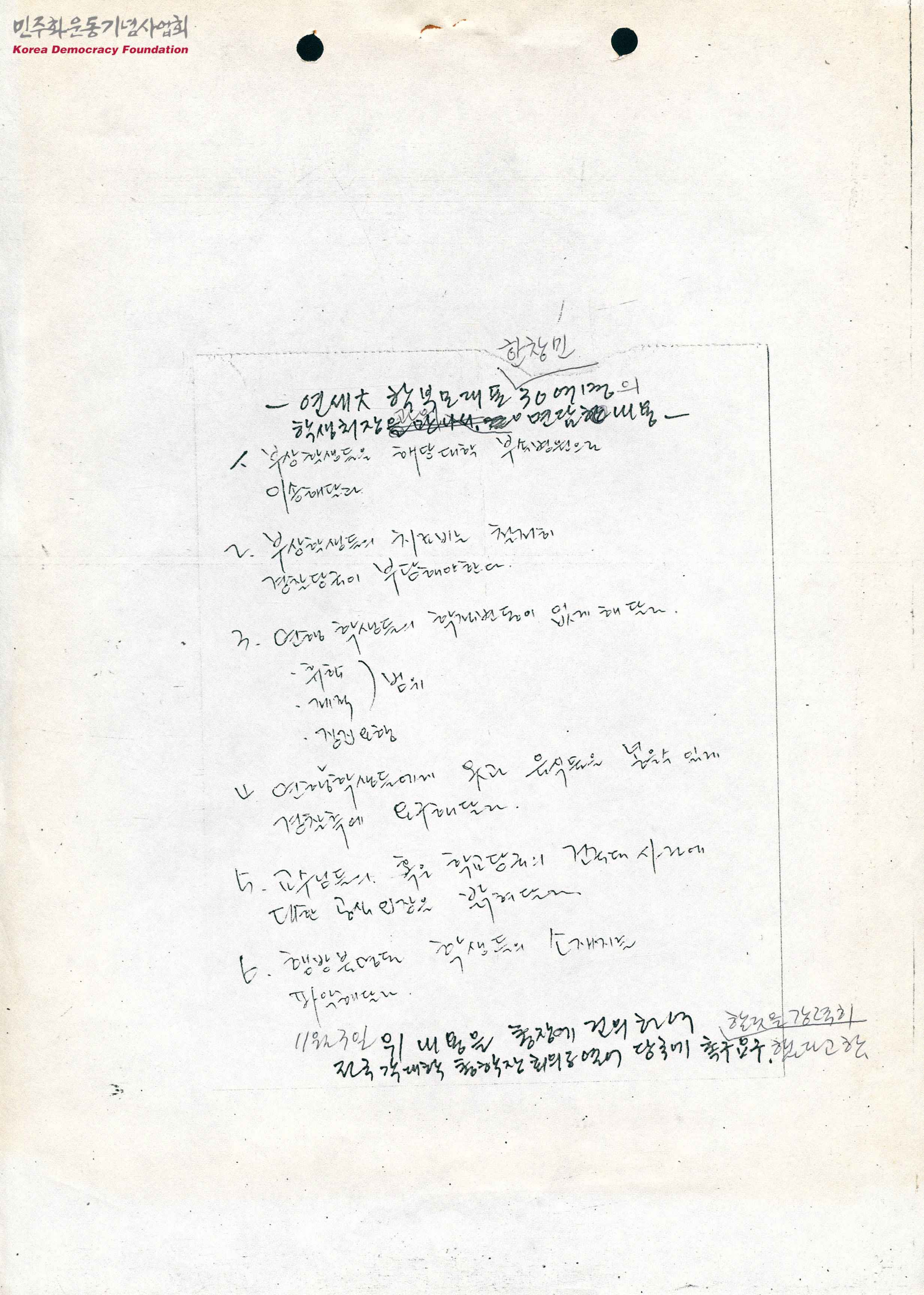 - 연세대학교 학부모대표 30여 명과 연세대학교 학생처장의 면담 내용을 적은 문서로 '부상 학생들을 해당대학 부속병원으로 이송해달라', '부상 학생들의 치료비는 철저히 경찰당국이 부담해야 한다', '연행 학생들의 학적변동이 없게 해달라' 등의 내용을 수록하고 있음